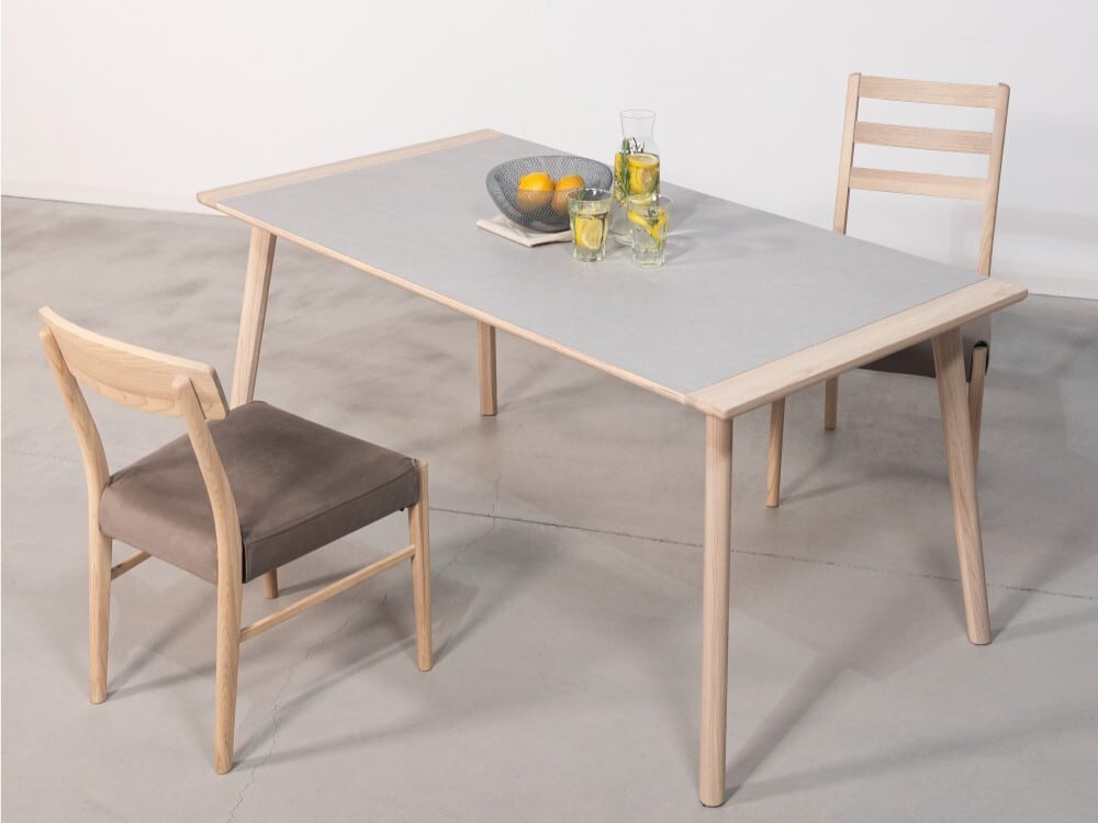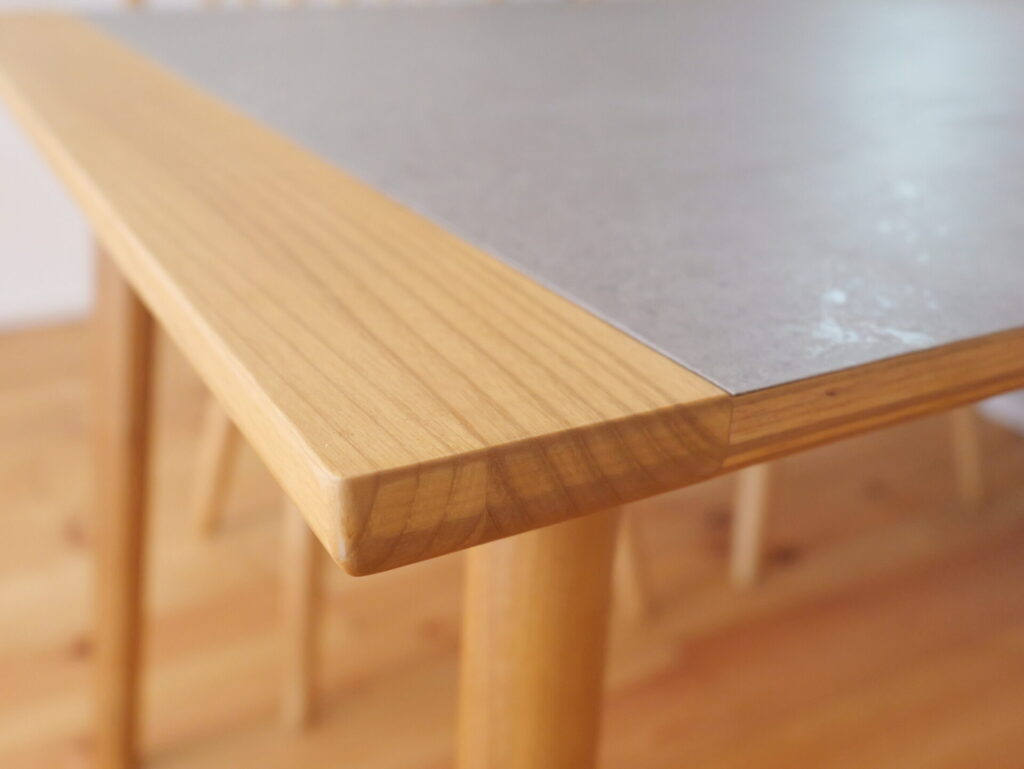 外壁漆喰の下地より着想した、天板の切り返しが個性的な、モルタル調テーブル。