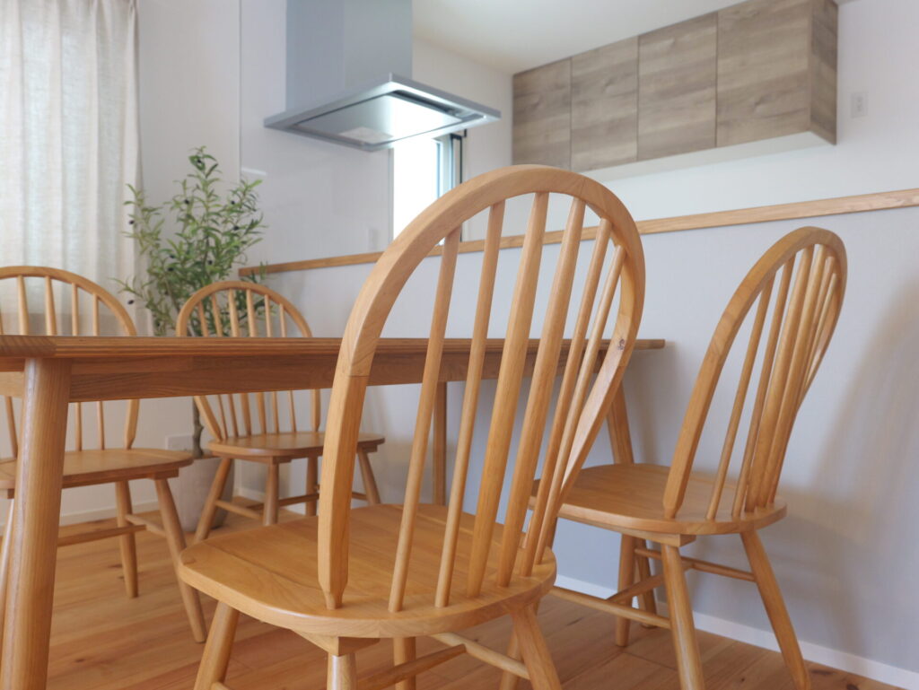 チェアの弓型の背もたれは “オープンスピンドル”(細い棒が並んでいて、隙間が空いているデザイン)になっており、デザインの良さに加え、圧迫感低減の効果も兼ね備えています。