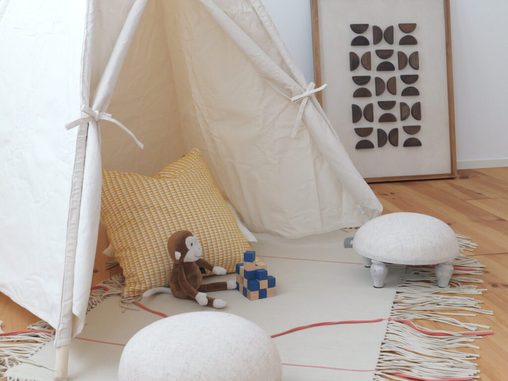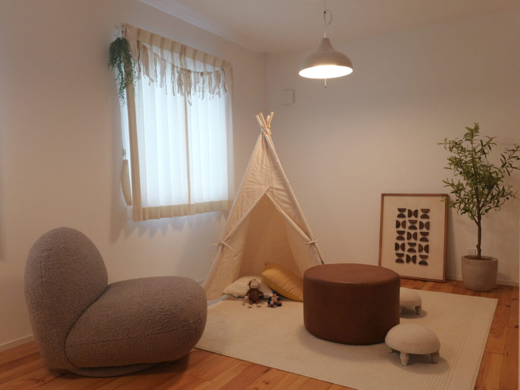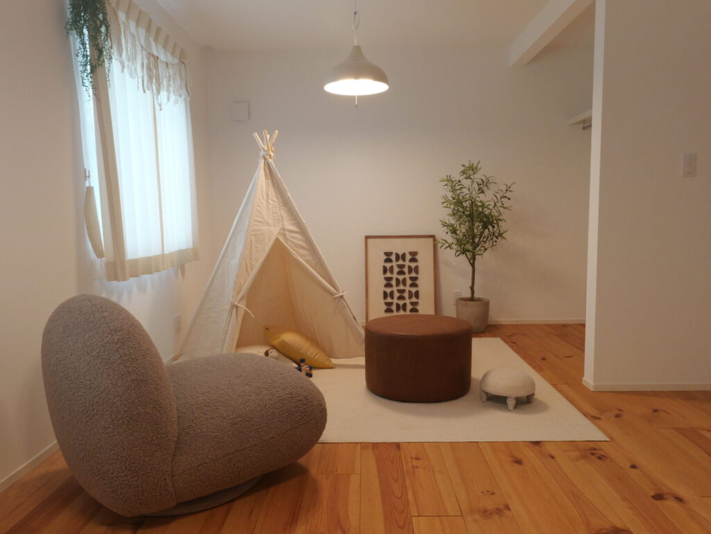 お家キャンプ体験ができるティピーテントで遊ぶ子を、眺めるだけで癒されるでしょう。