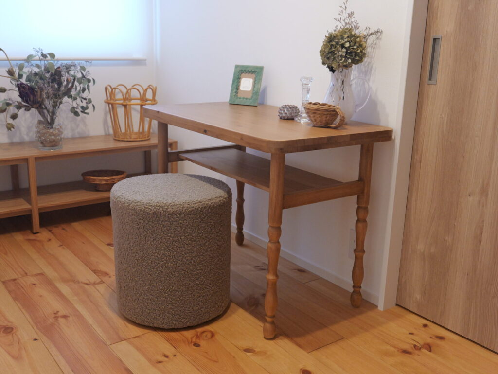 「家事をする場所」と限定したくなく、「家事も出来る場所」にするため、スペース最小限の奥行き浅めデスクとスツールを配置しました。