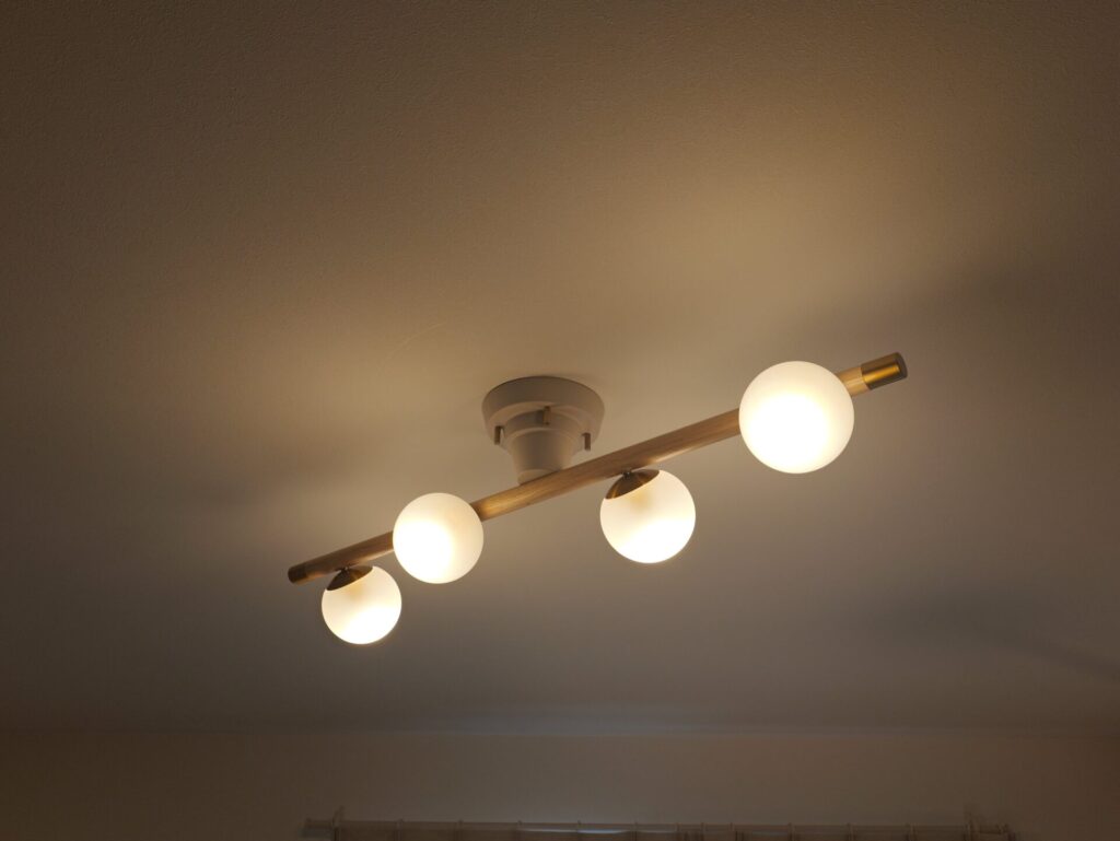 柔らかな印象ながら、空間を締める変形ライトが、ダイニングを優しく照らします。