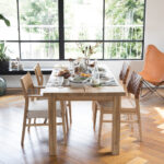 シンプルなラインのチェアは、座面の編み込み(ペーパーコード)が上品さをプラスしています。