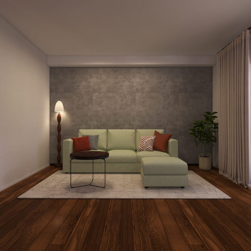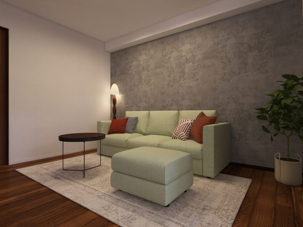 余白に寂しさを感じないように、ラグ・サイドテーブル・スタンドライトの計3点という少ないアイテムでも満たされる空間にしました。