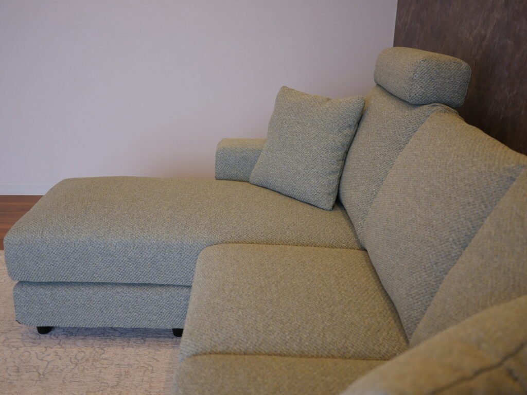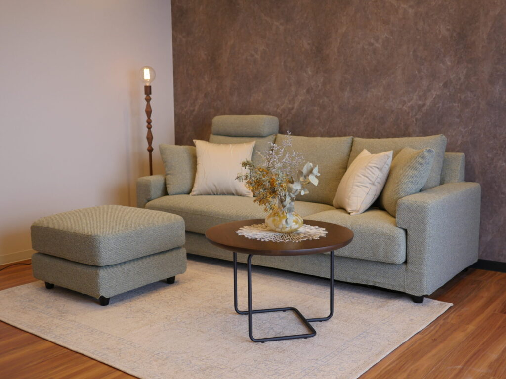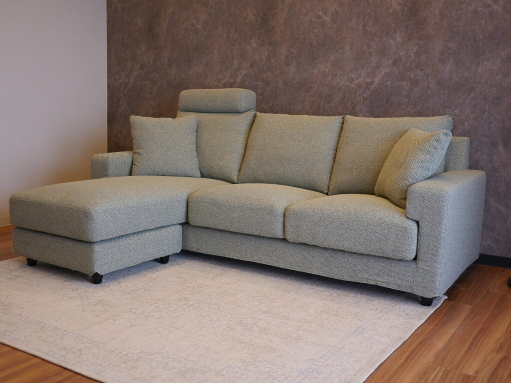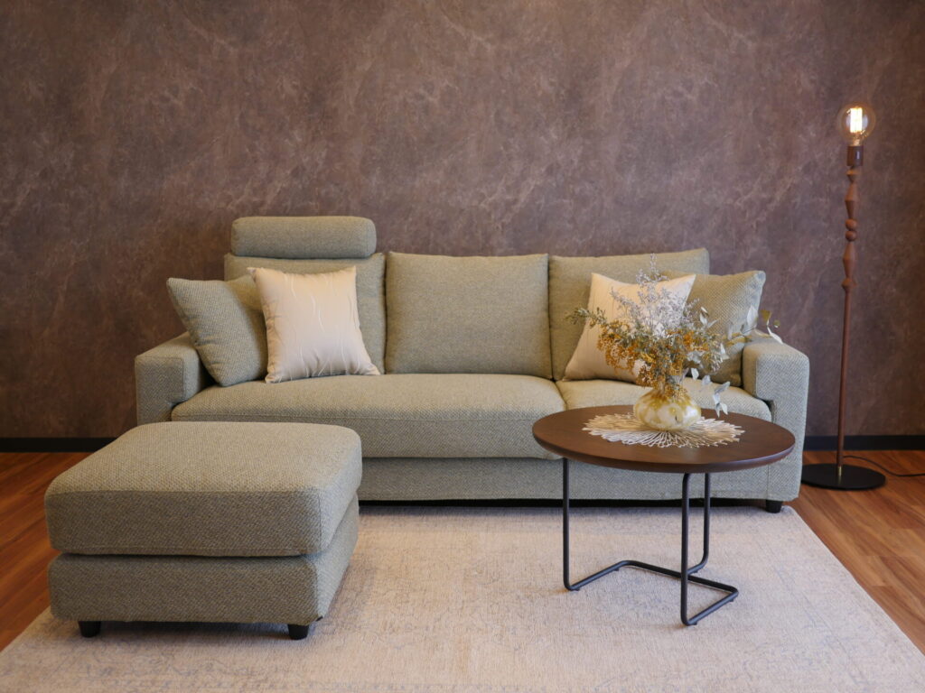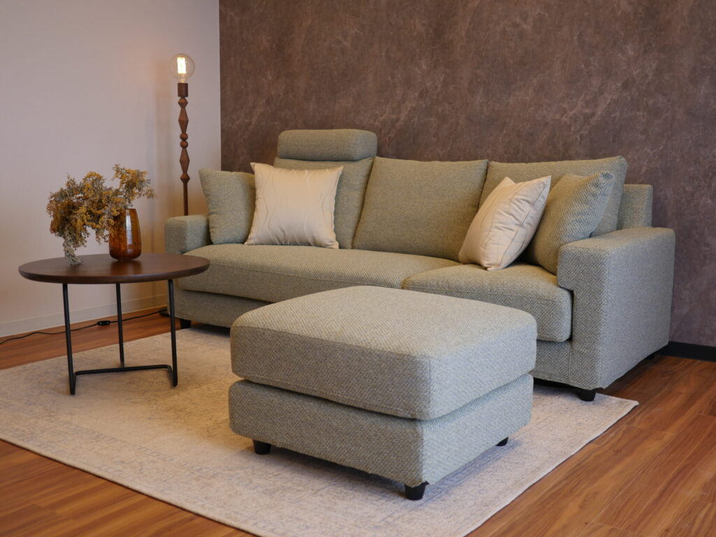 スタンダードなフォルムで、流行に左右されない落ち着いたスタイルのソファは、座面の向きを変え、オットマンと合わせる事で L字にすることが可能です。