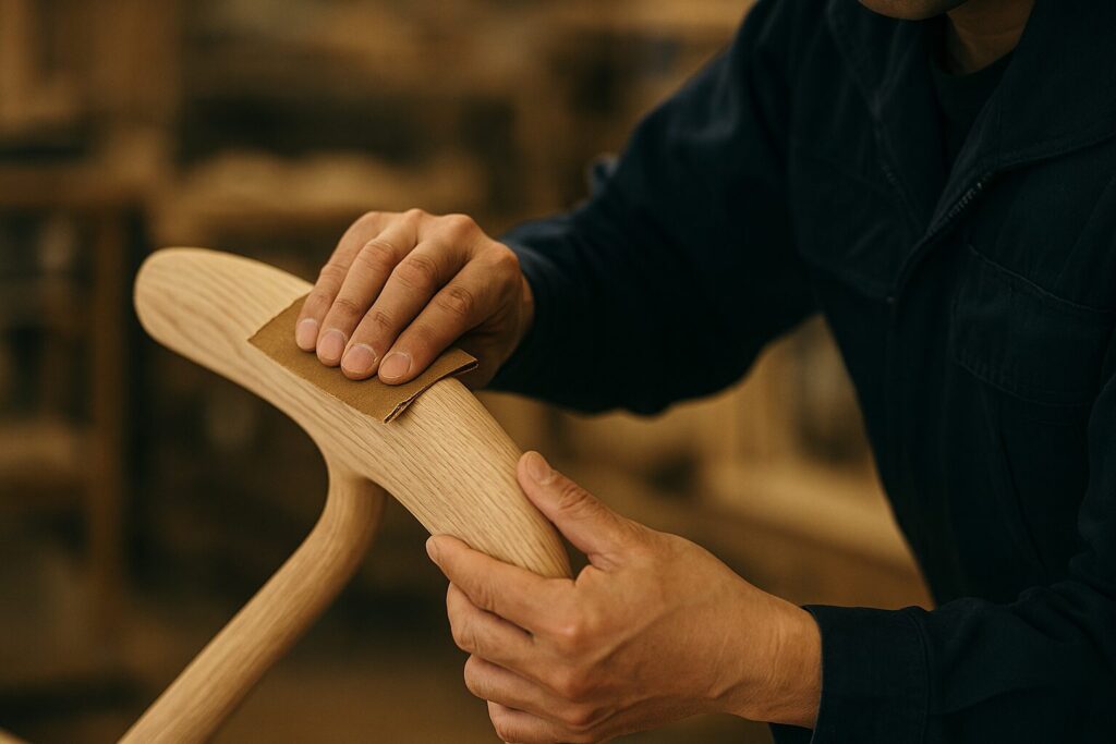 特にヒロシマチェアのアームは、一本の無垢材を削り出し、なめらかな曲線を出す工程に高い技術を要します。一般的には難しいこの加工を量産レベルで可能にしているのは、広島の家具産業が積み重ねてきた歴史とノウハウの賜物です。