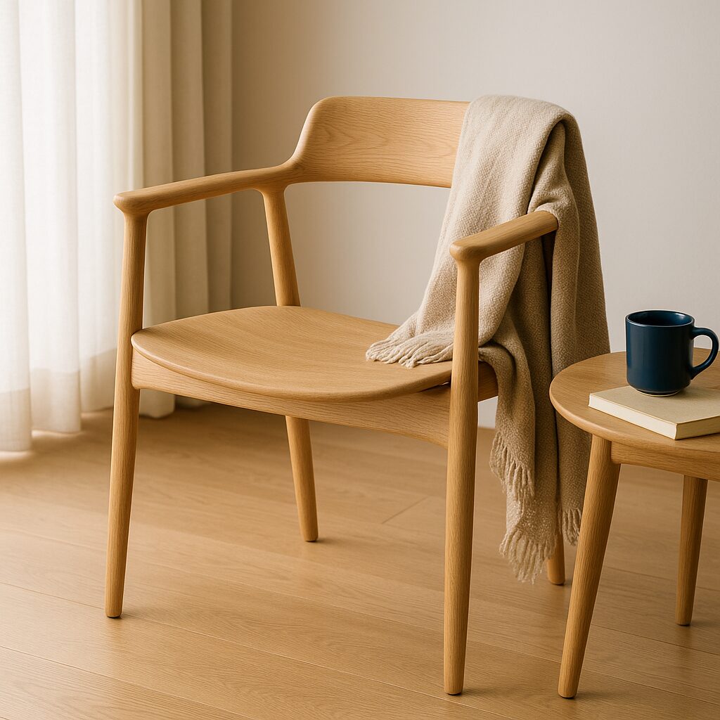 また、座面や背もたれは必要以上に厚くせず、軽やかに仕上げられています。長時間座っても疲れにくいよう角度が計算されており、木の椅子でありながら「硬さ」を感じさせません。この緻密なバランスが、多くの人に「長く使いたい」と思わせる理由のひとつです。