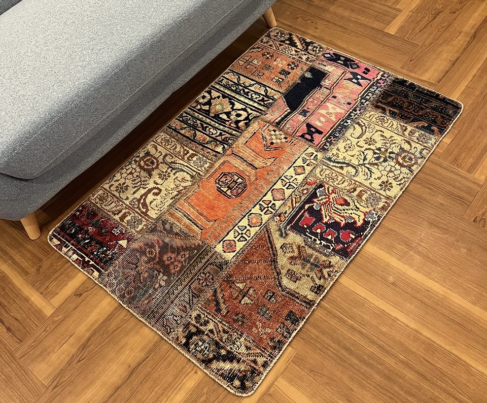 異なる時代、異なる物語を持つ絨毯の一片一片が集まり、新たなる物語を紡ぎ出すパッチワーク絨毯へと生まれ変わったものです。