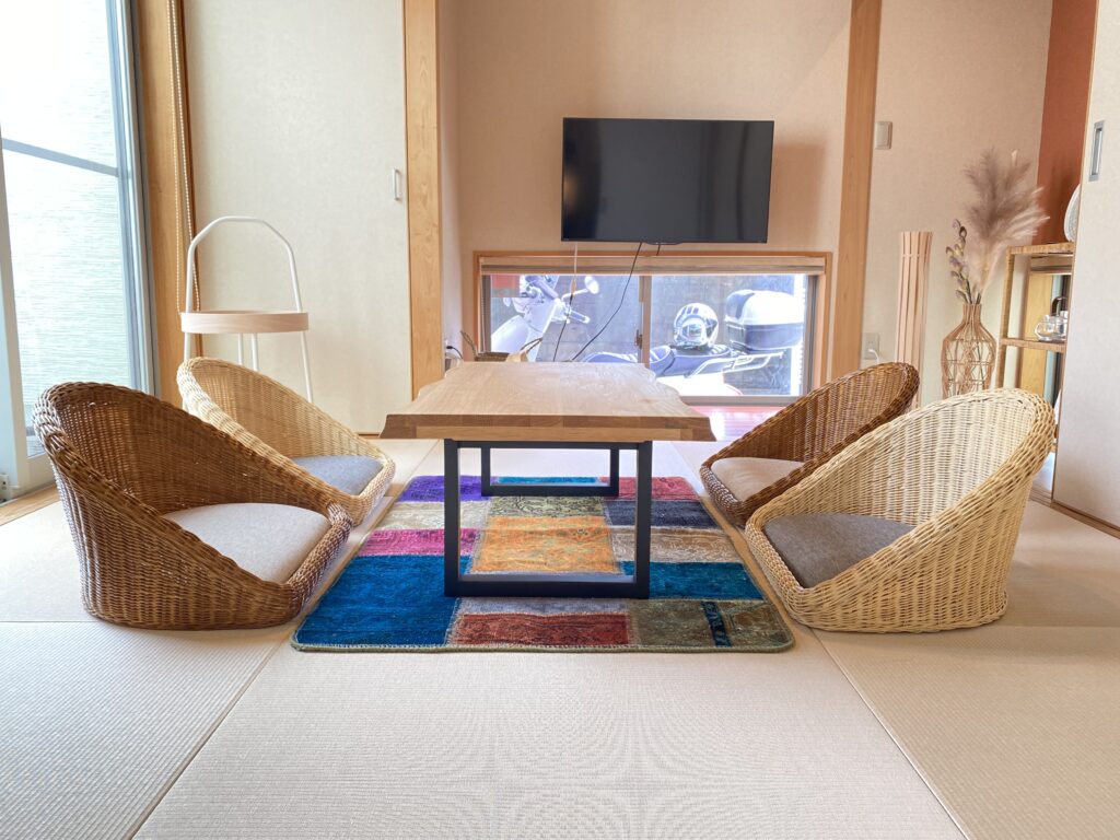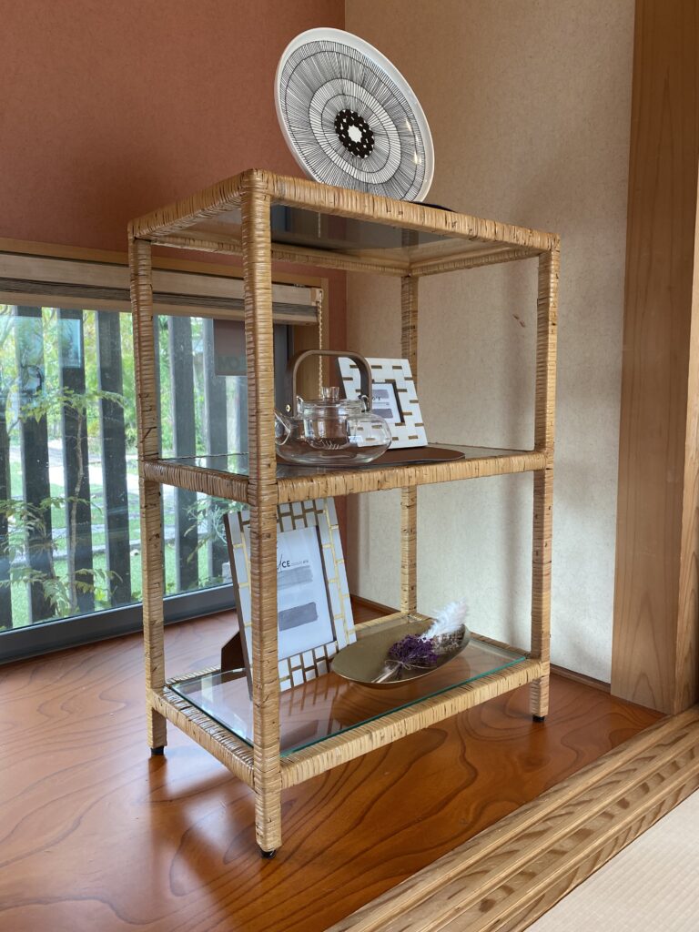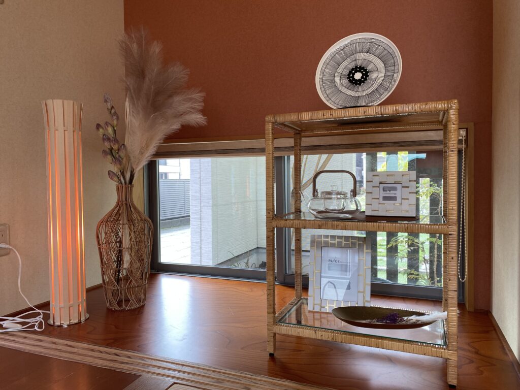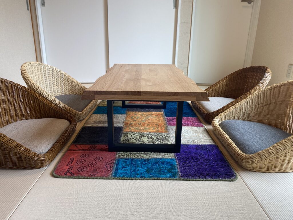 和室の落ち着きのある静けさをベースに、天然木・ラタン(籐)・カラフルなパッチワークラグで、和モダンのなかに遊び心のあるアクセントを取り入れたコーディネートになりました。