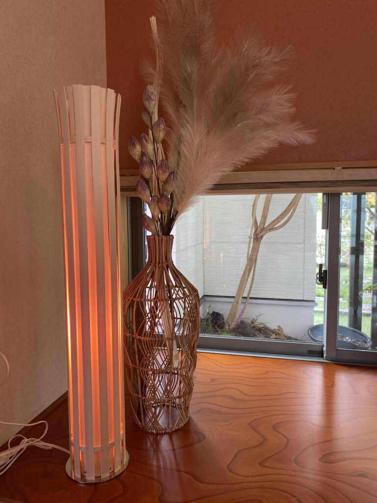籐で編んだフラワーベースには、パンパスを挿し季節感と色の調和を演出。