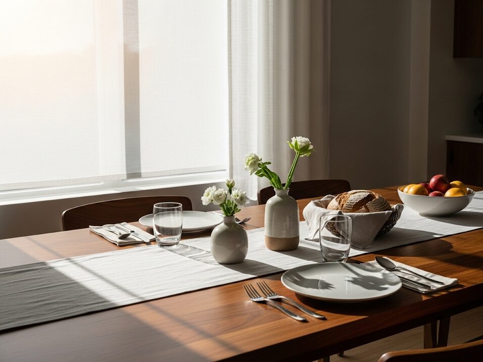 直射日光は木の天敵ではありませんが、急激な変化は避けたい。レースカーテンやブラインドやプリーツスクリーンで拡散し、テーブルは使わない時間にランナーを置くなど「影をデザイン」します。