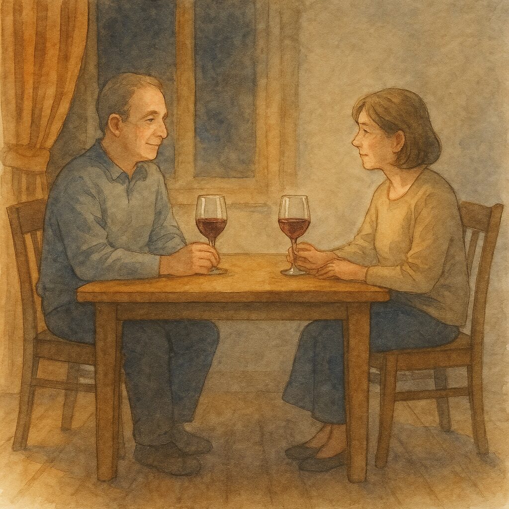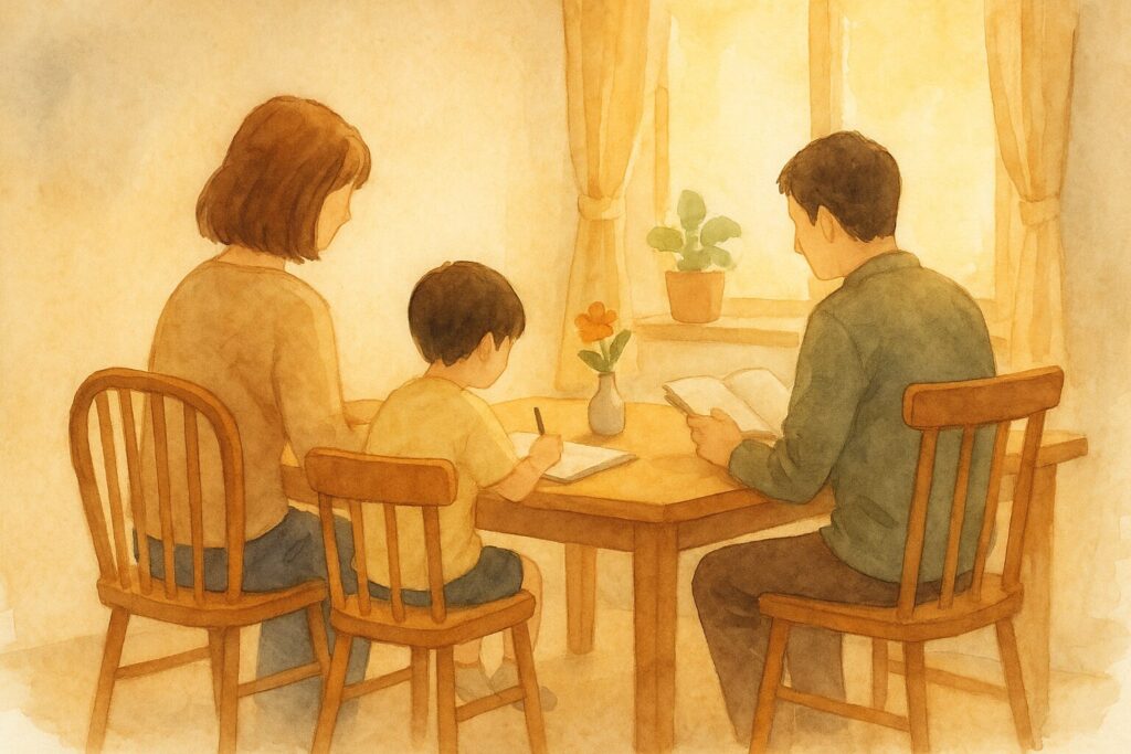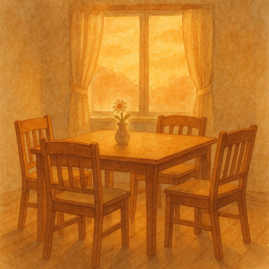 子どもが小さな頃は食べこぼしでテーブルが汚れ、宿題のノートが広がり、休日には家族でボードゲームを楽しむ場所になる。やがて子どもが巣立ち、夫婦二人だけの食卓に戻ると、そのテーブルは落ち着きと静けさをまといます。