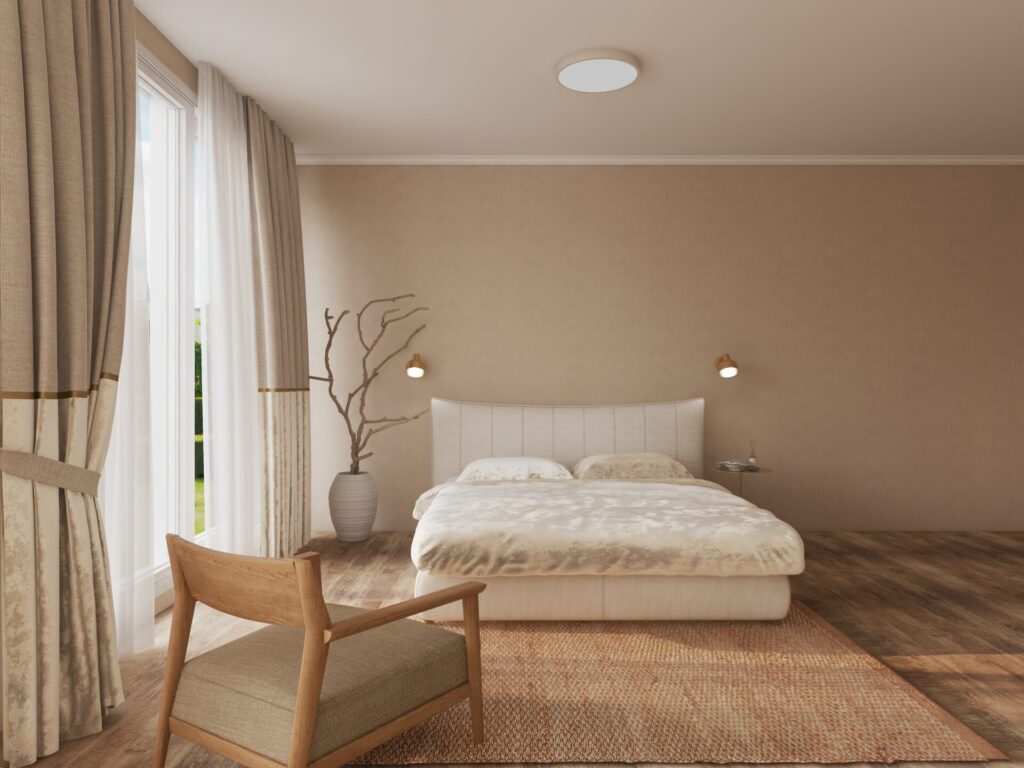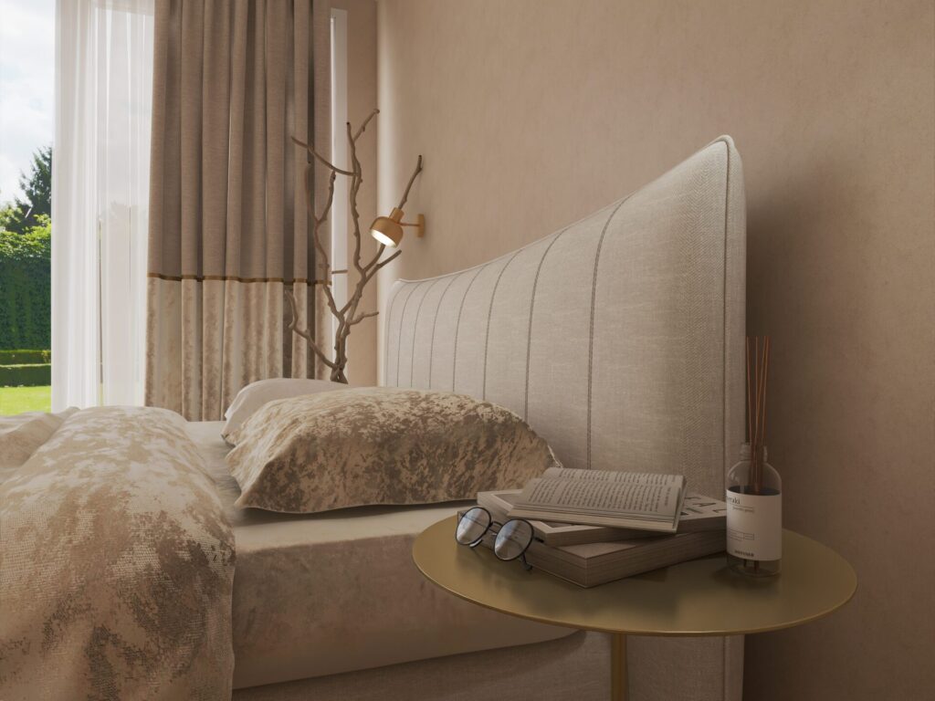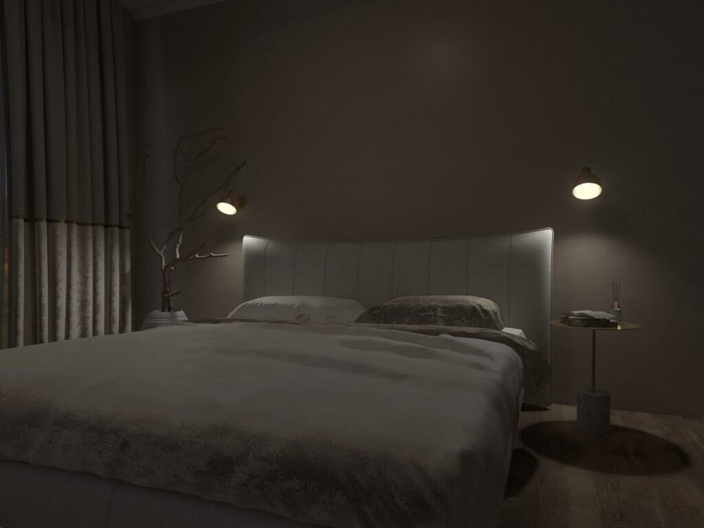 光はベッドの端を撫で、丸みのある照明の影を淡くゆらす。