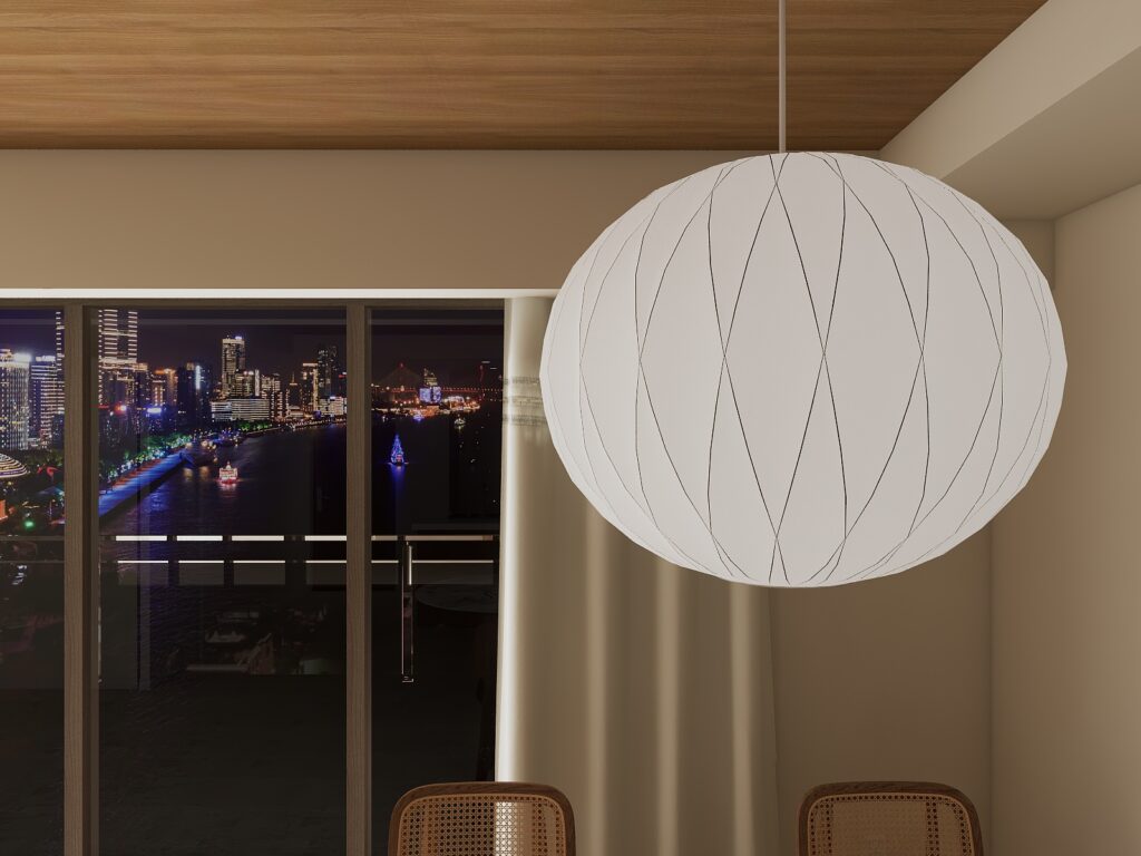 夜には照明の柔らかな球体が空間全体に静けさを与える。
