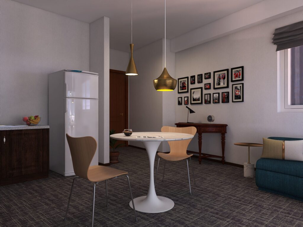 大理石調の丸テーブルを中心に配置しました。丸い形は家族の視線が自然と合うため、会話が弾みやすく、日常の食事から週末の映画鑑賞後の語らいまで、家族の団らんを育みます。さらに、ロンドンのクラシックホテルを思わせるような質感を持たせ、特別な時間を感じられる場にしました。