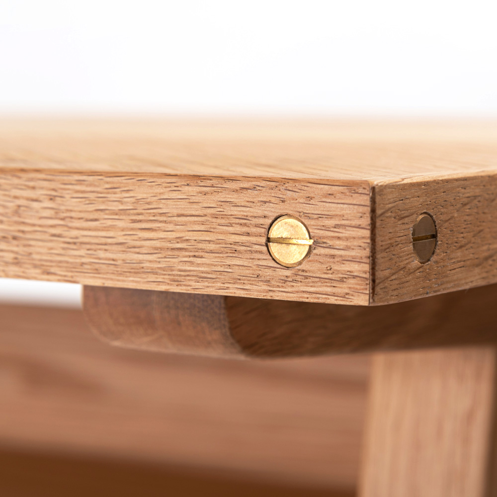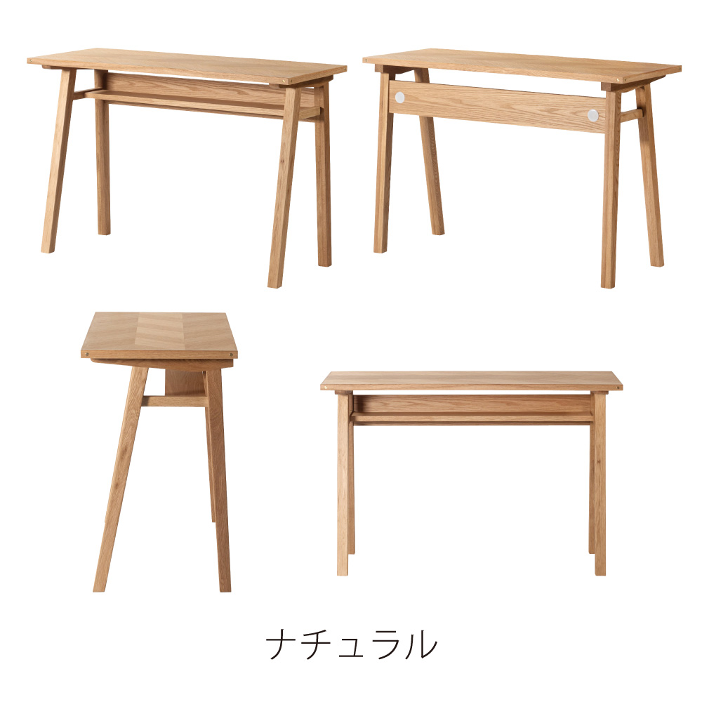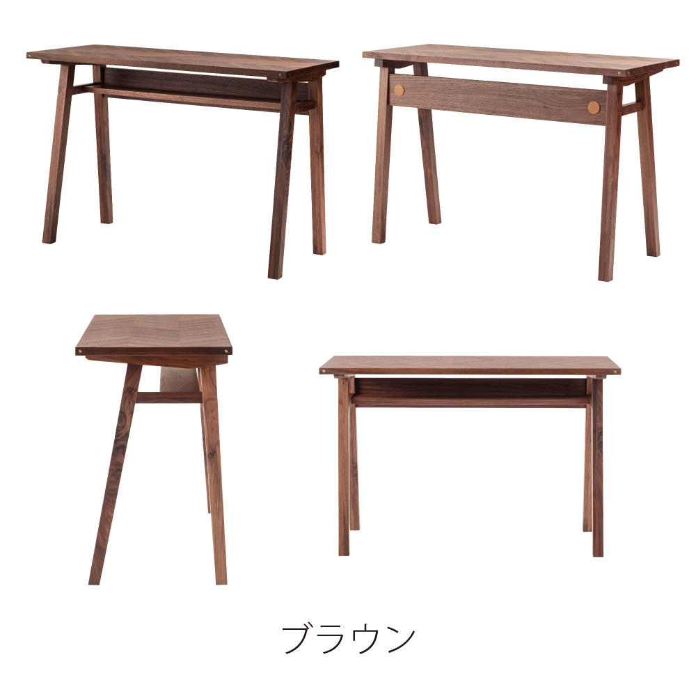 天板は木目の向きを変えて貼り合わせた矢張りデザインで、側面に施した真鍮がアクセントになっています。引き出しなどの収納はあえて省き、さりげなく棚板を設け、ちょっとした収納にも対応しています。インテリアに馴染みやすい2色展開です。