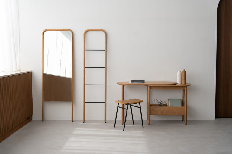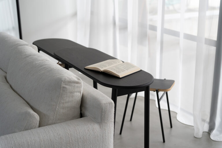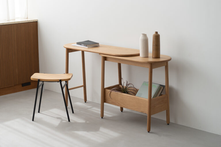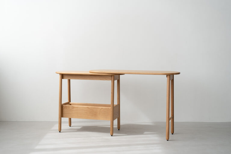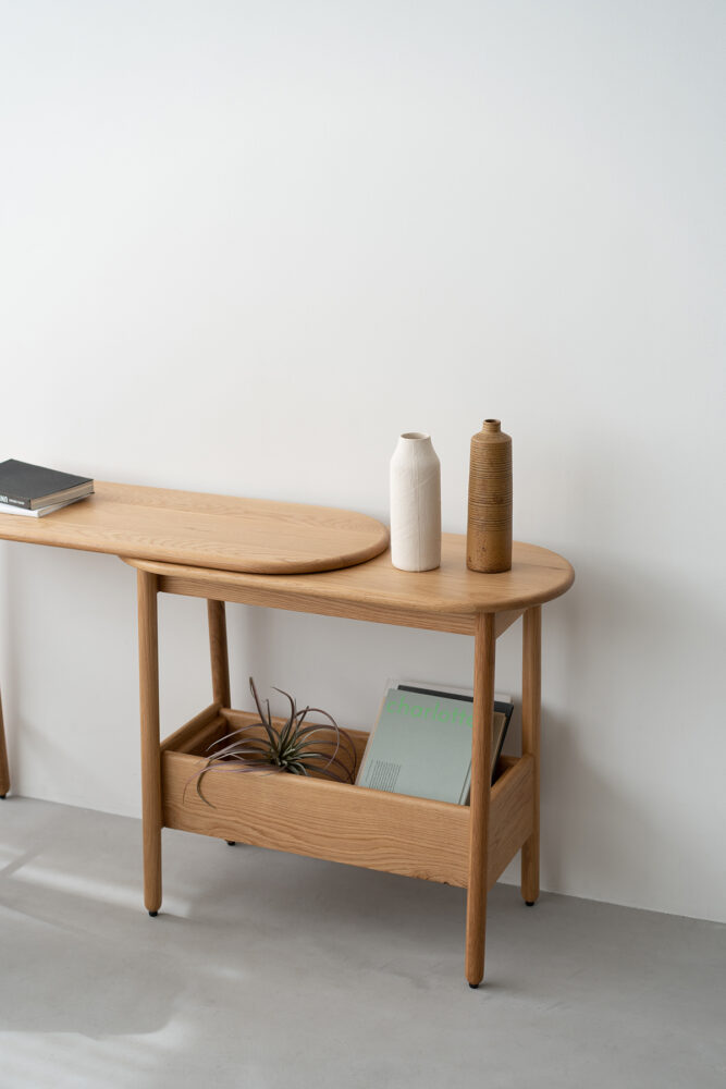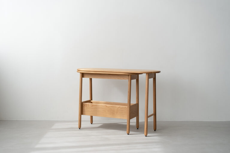 丸みを帯びたオーク無垢材の天板は、光を受けて穏やかに輝き、部屋にやさしい表情を添えている。
