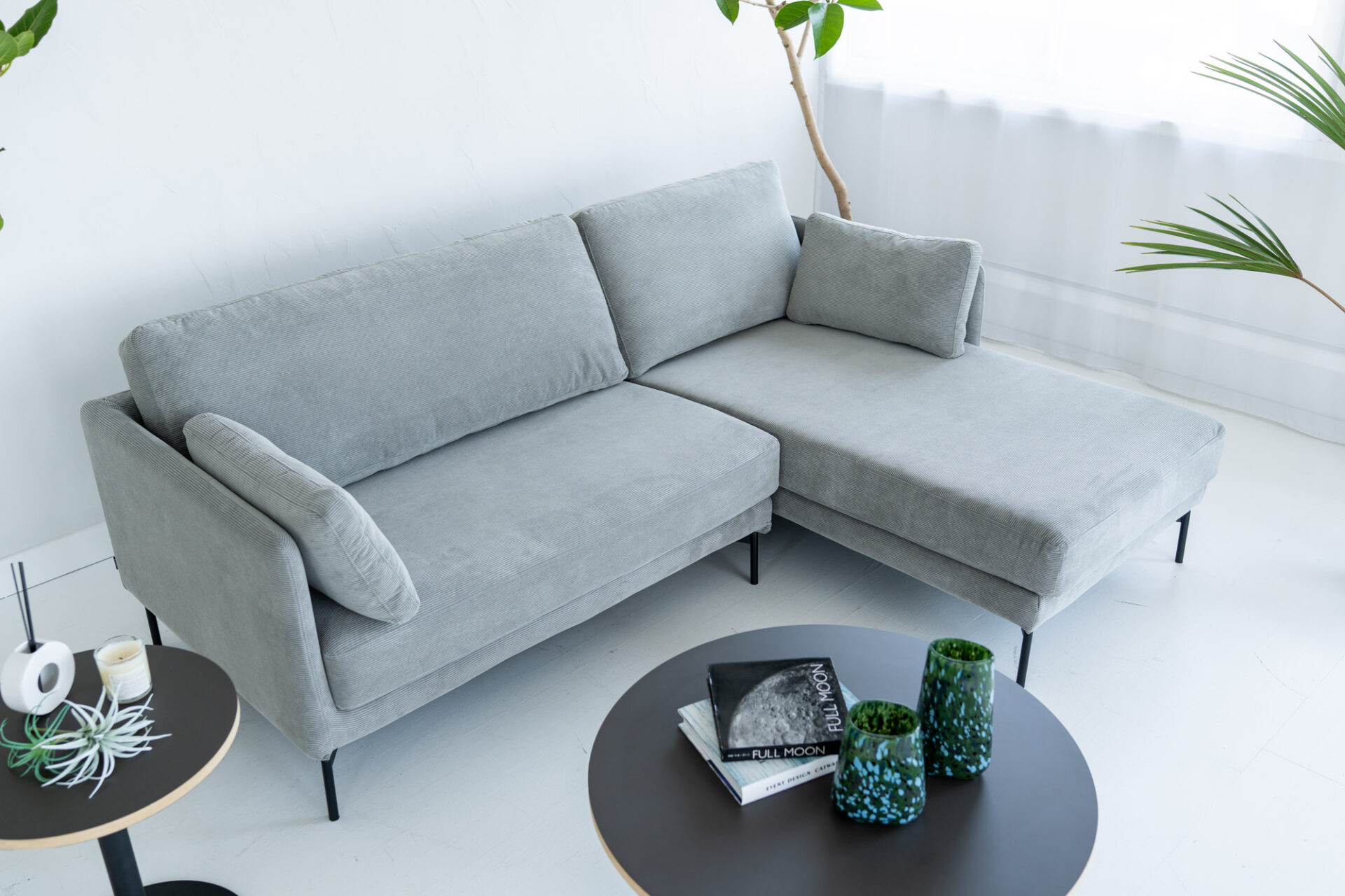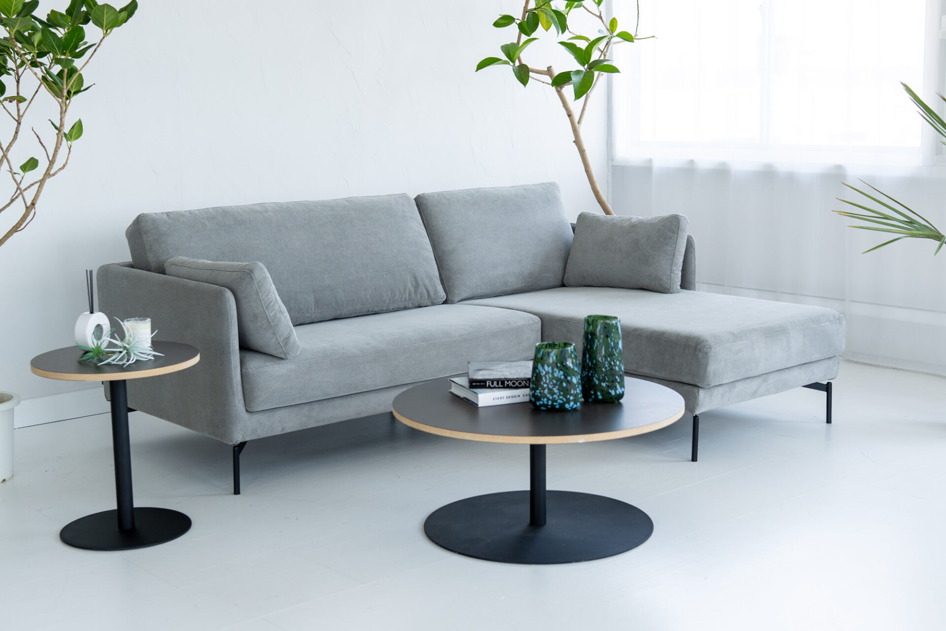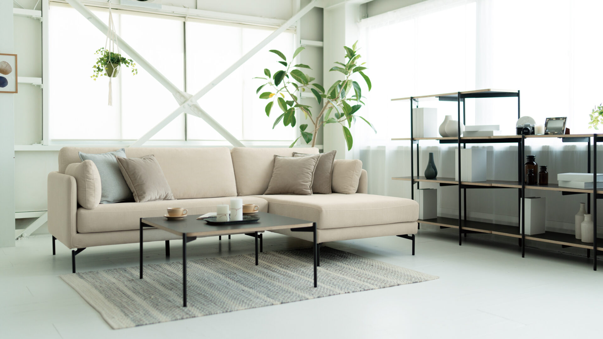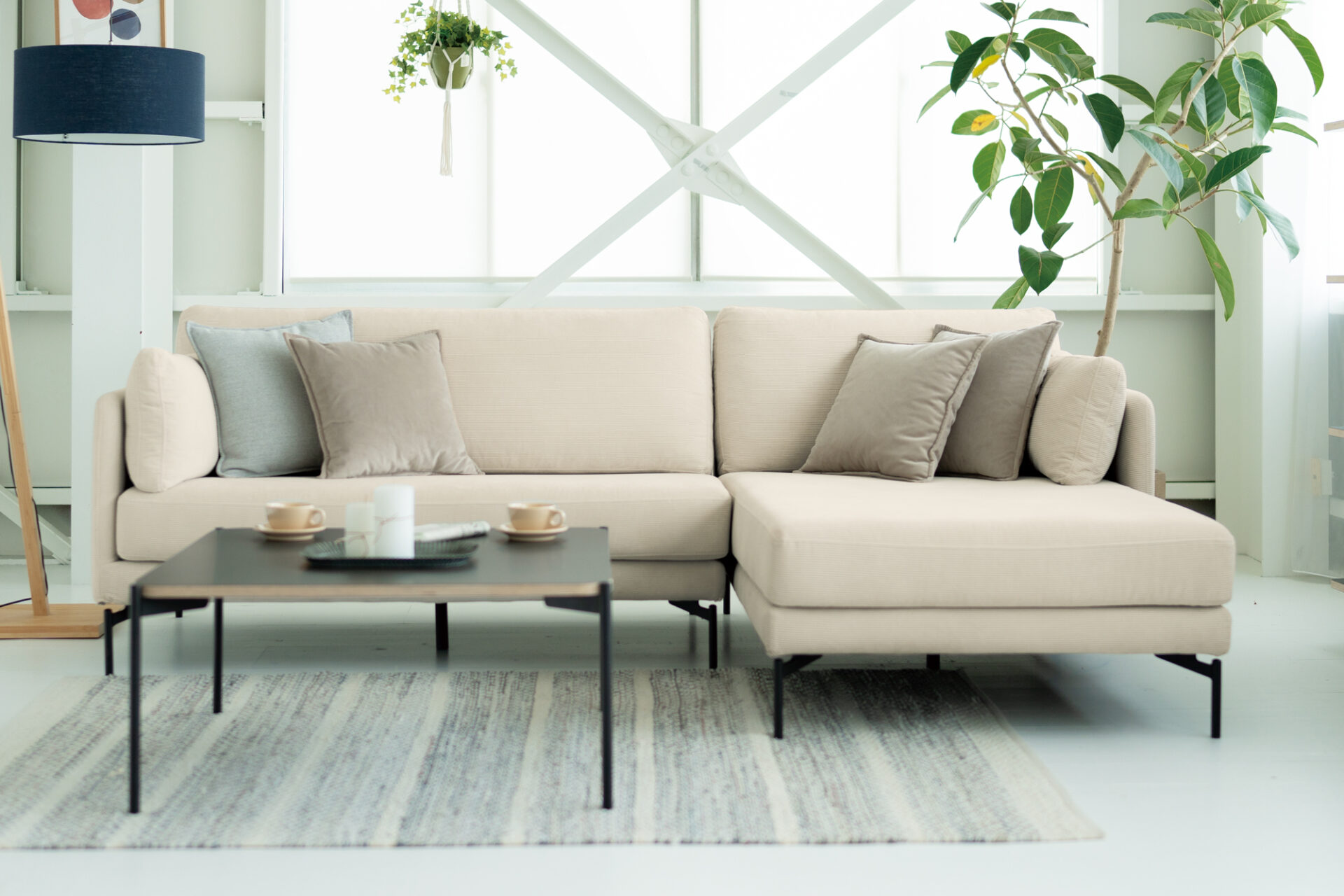 シンプルでクリーンな印象の本体とマットブラックの金属脚のバランスが美しいカウチソファです。