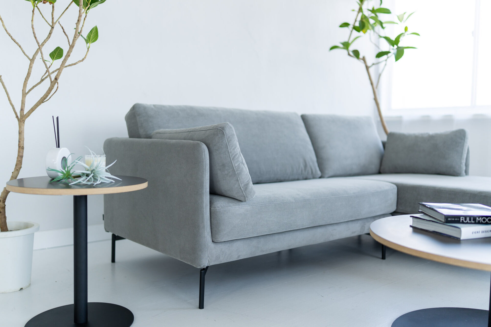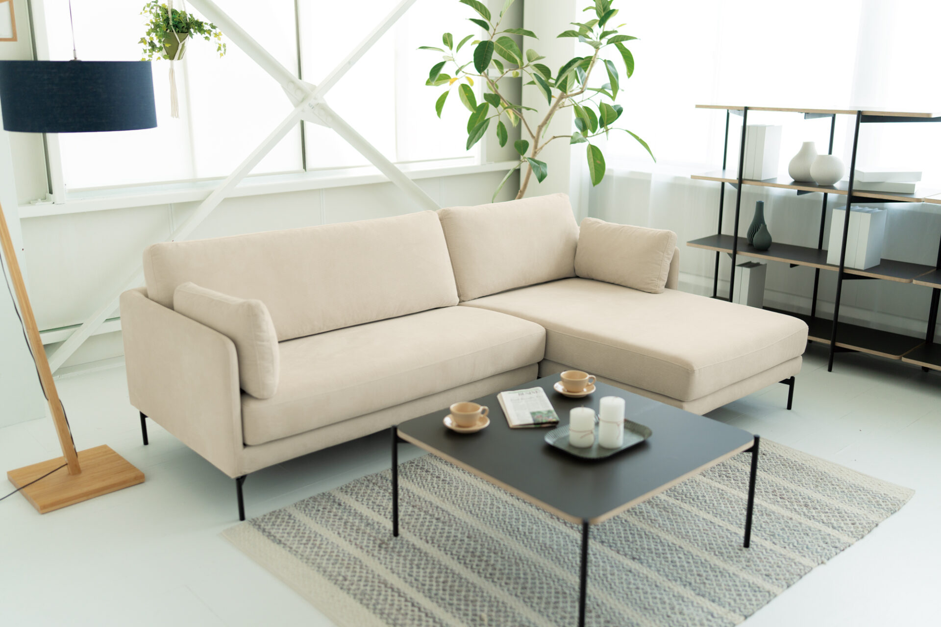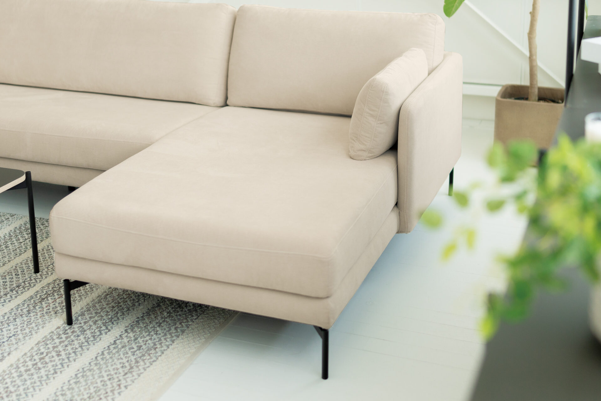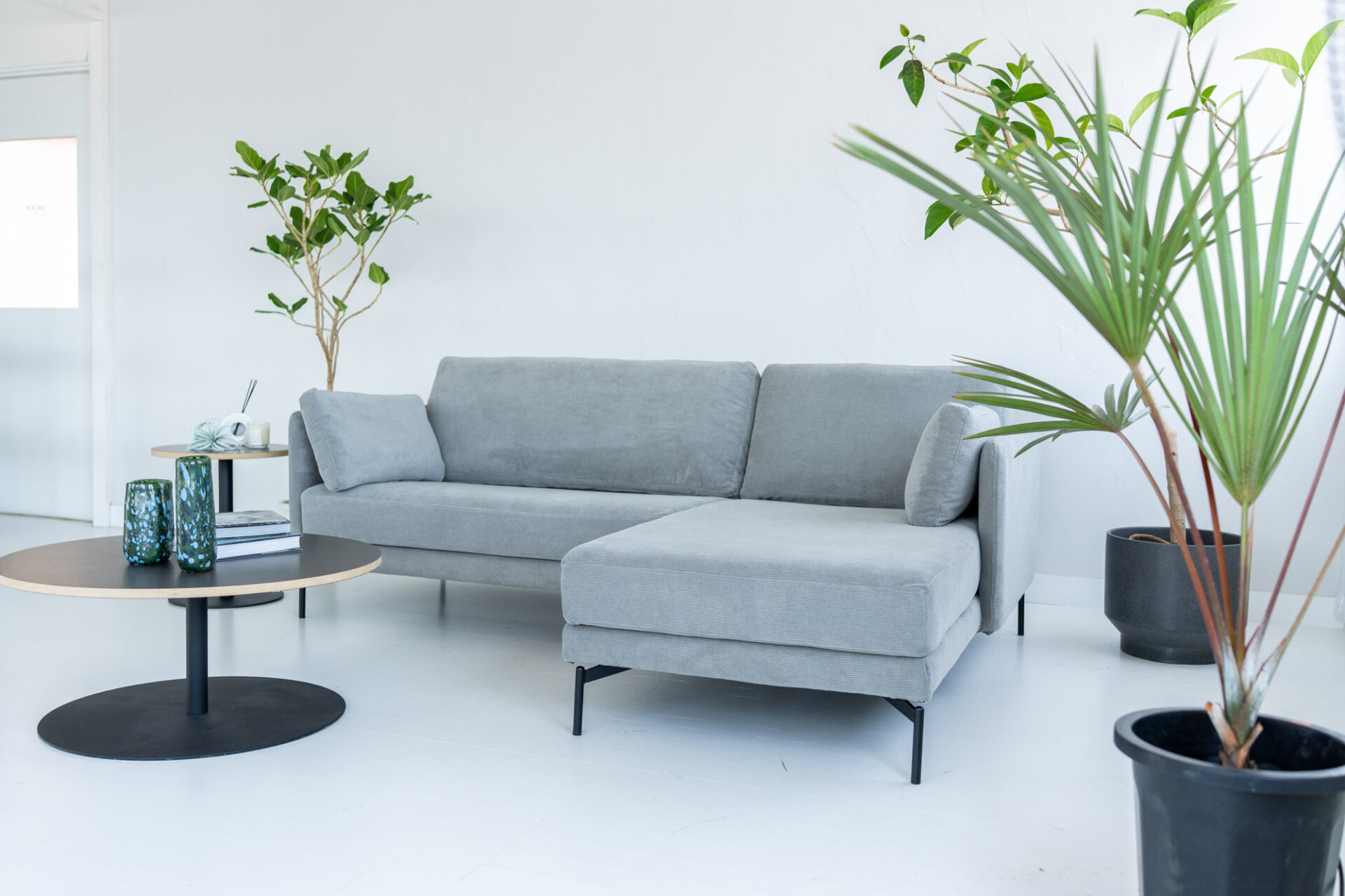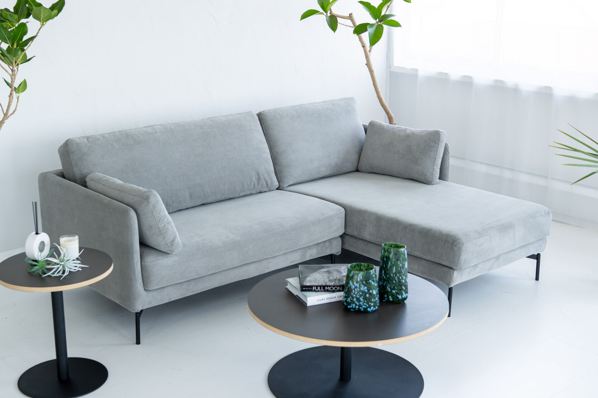 シンプルでクリーンな印象の本体とマットブラックの金属脚のバランスが美しいカウチソファです。