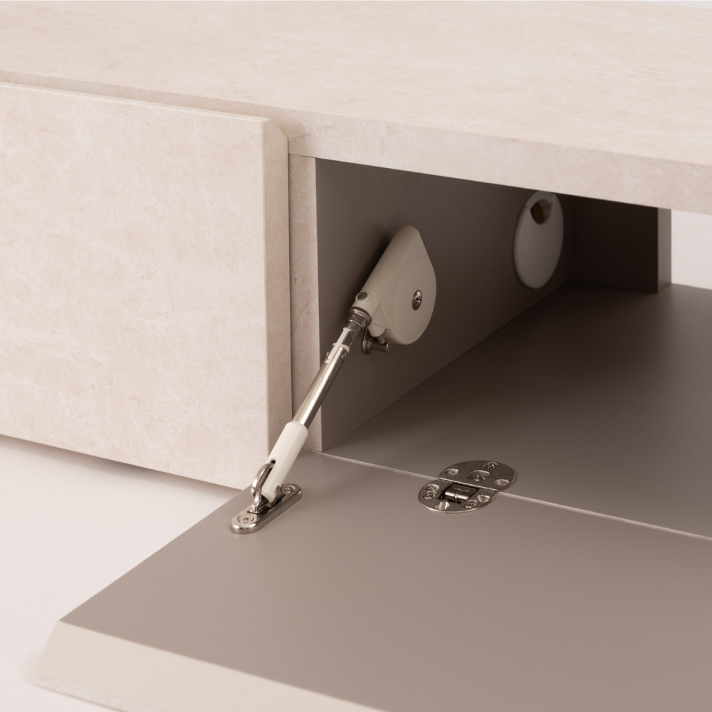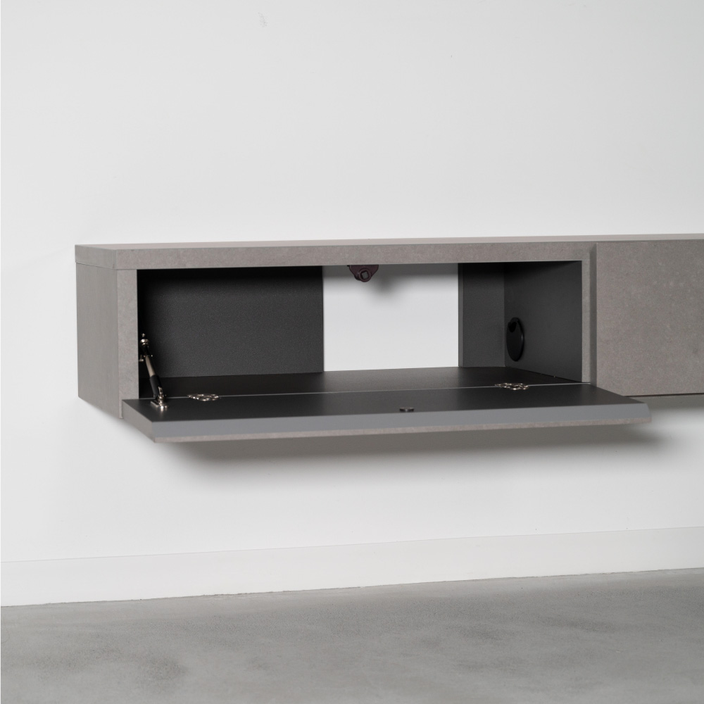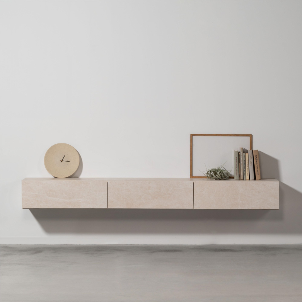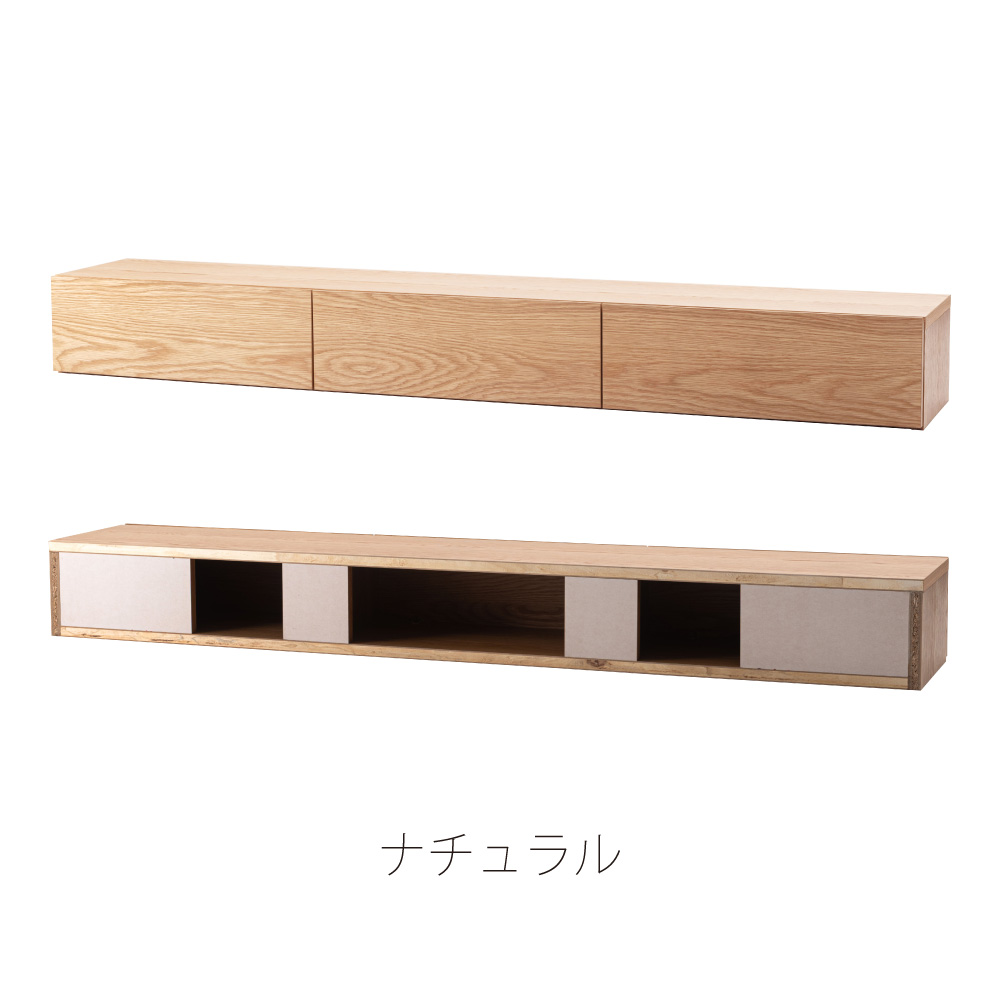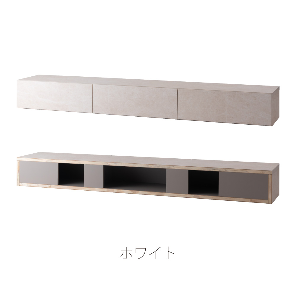 床から浮いたテレビボードが部屋に余白を生み出し、走り回る動きさえ風景の一部のように溶け込んでいく。