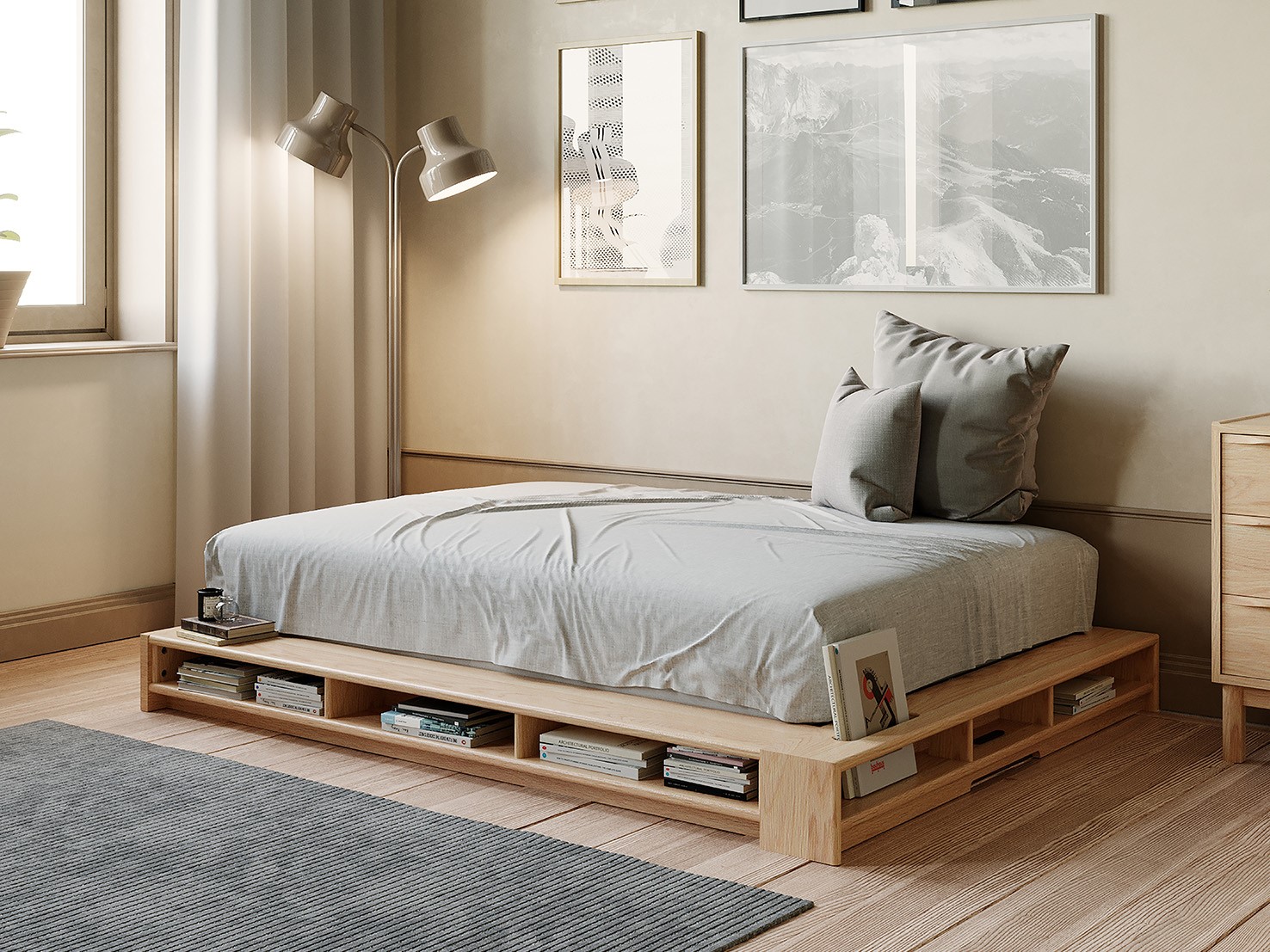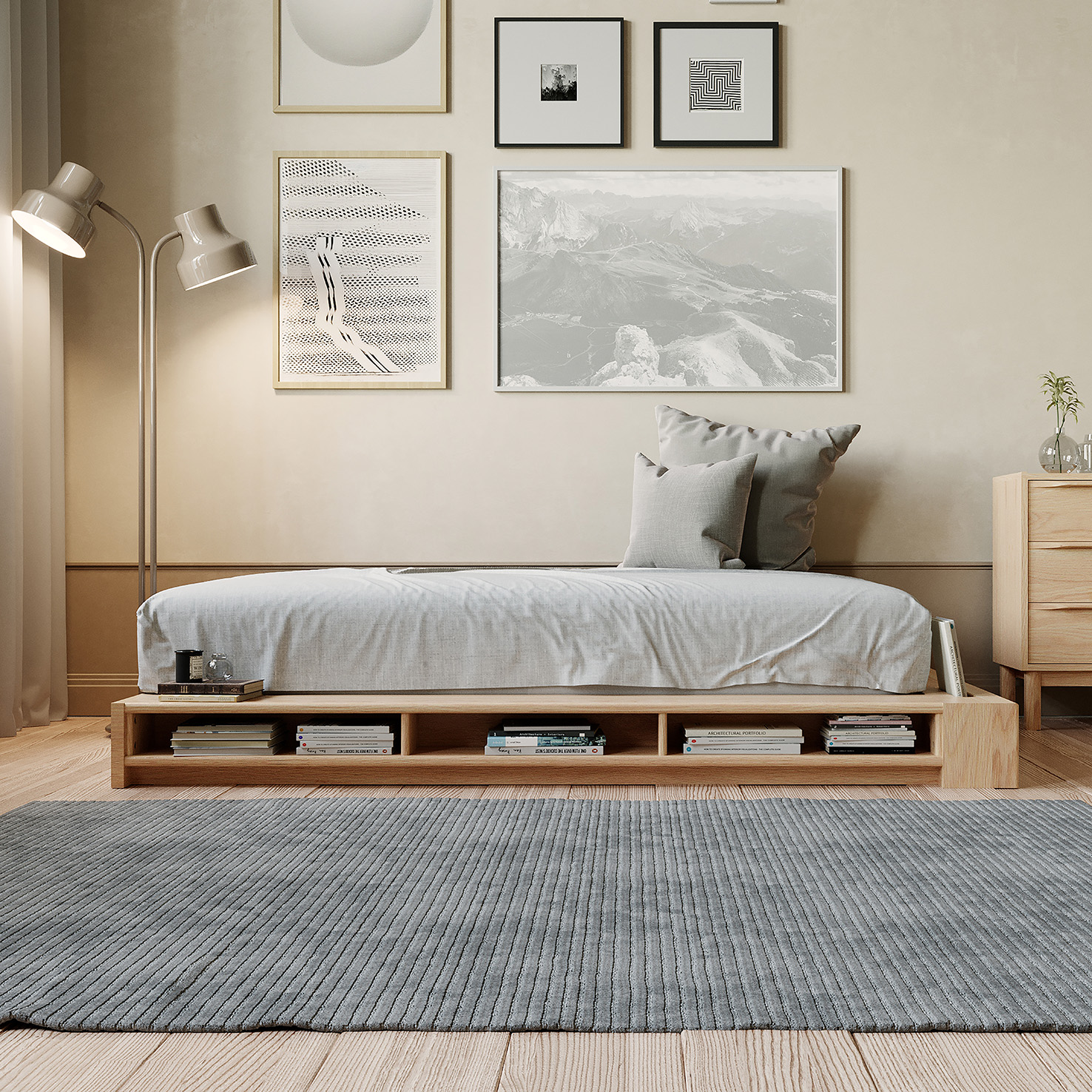 そのフレームの低さは、空間に安心感を与え、まるで床とつながっているかのように自然に馴染んでいる。