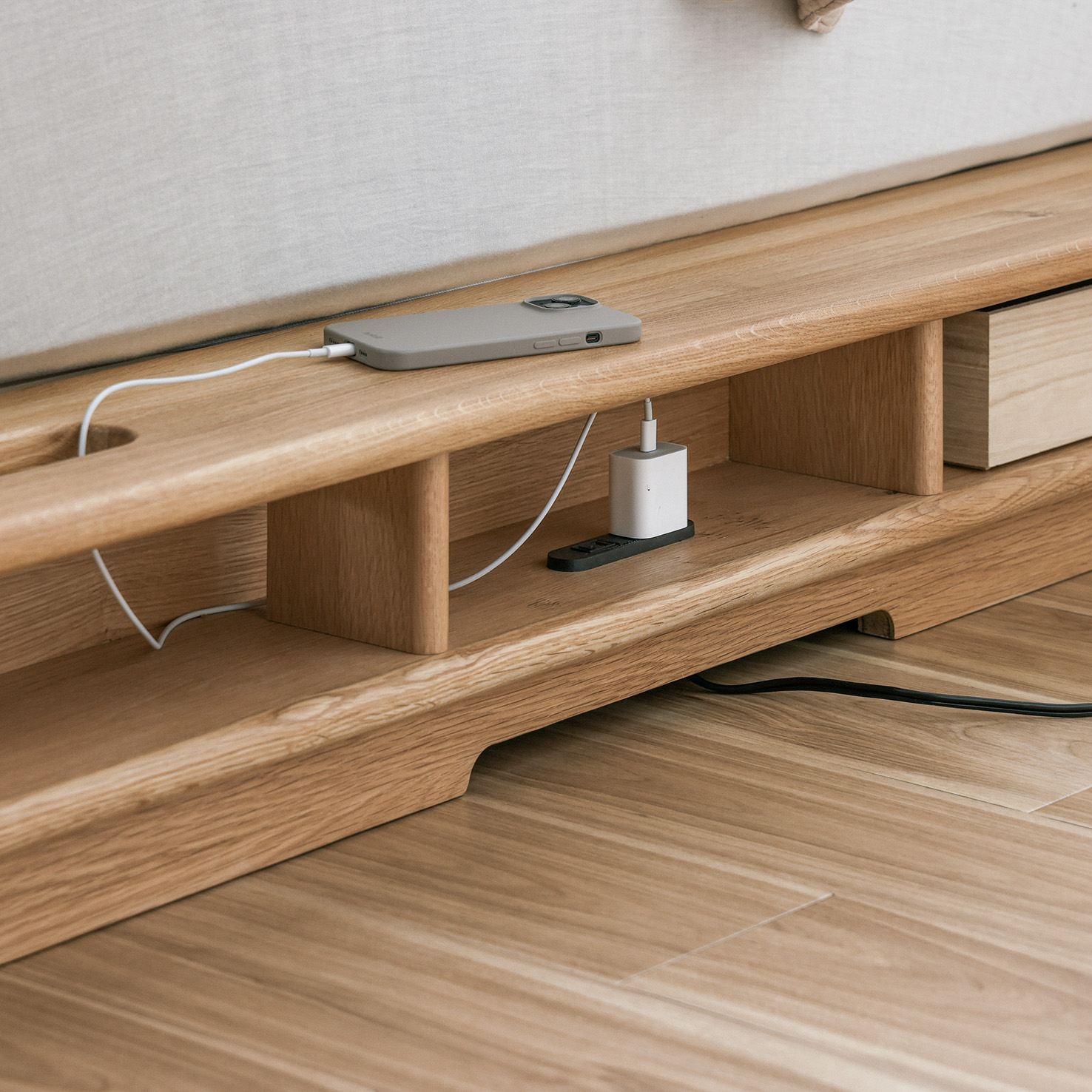 ヘッドボードの棚には2口コンセントが備えられているため、スマートフォンや電子機器の充電の際に重宝。