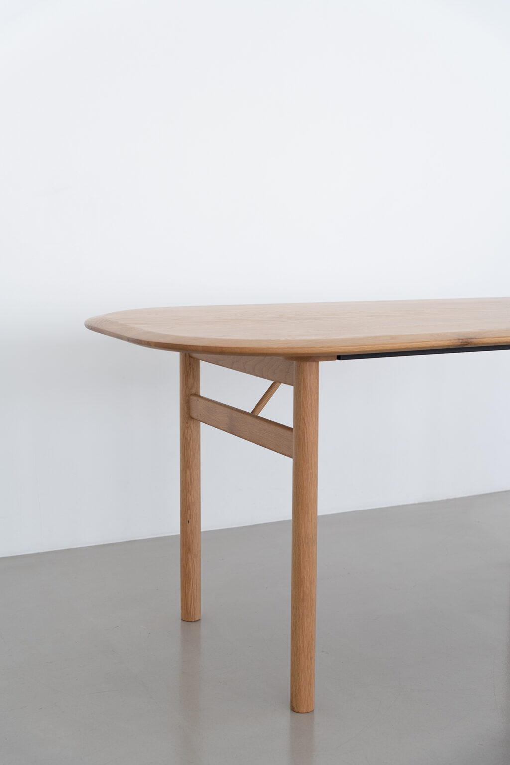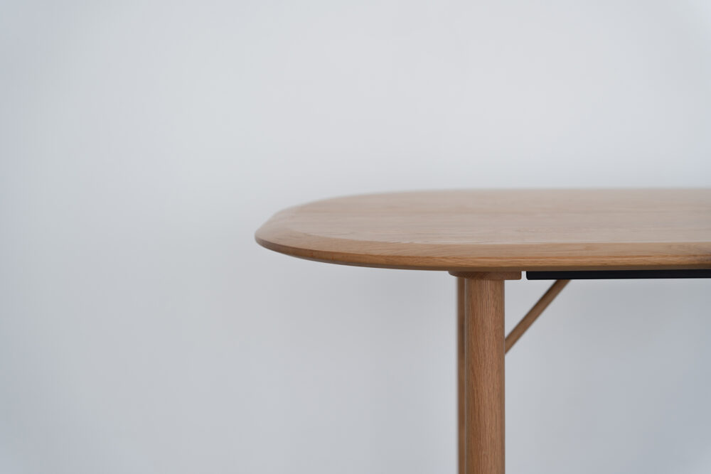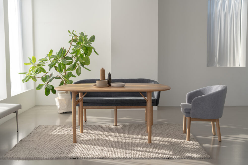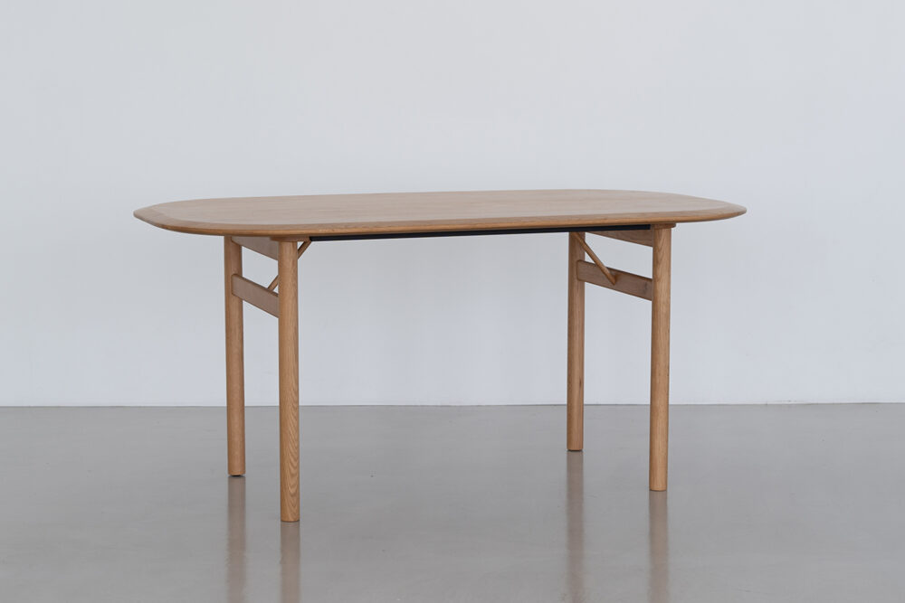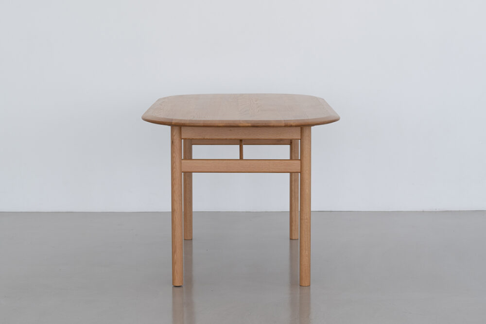 「Merry」は、家族のまんなかに置くための、楕円形のダイニングテーブル。角のないかたちは、誰もが自然に向き合えて、視線が交わり、声が届きやすくなります。おしゃべりも、ふざけあいも、子どもの描いた落書きさえ、家族の記憶としてこのテーブルに残っていく——