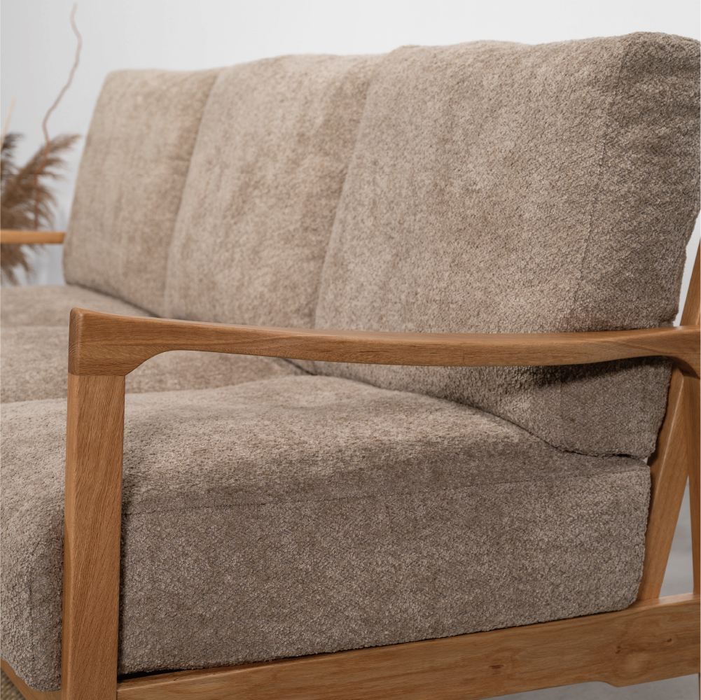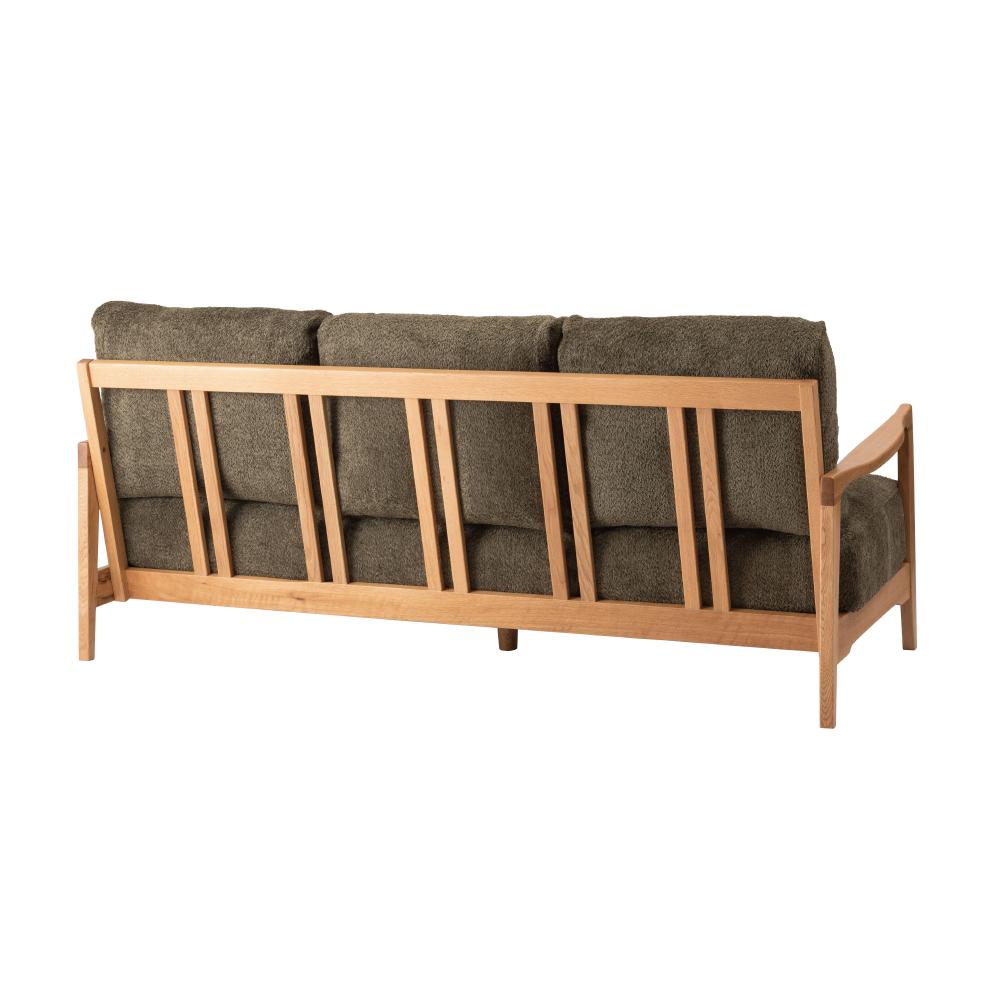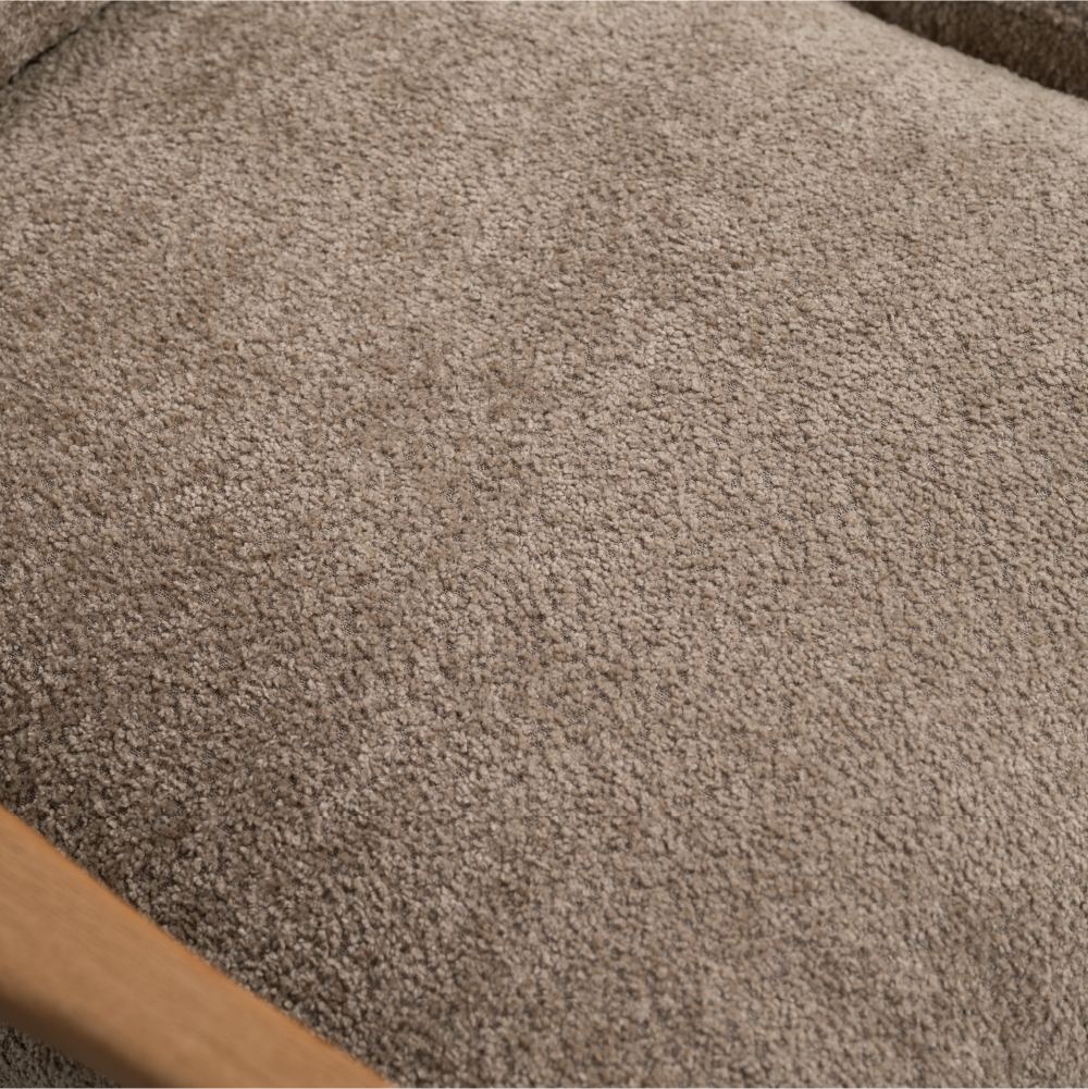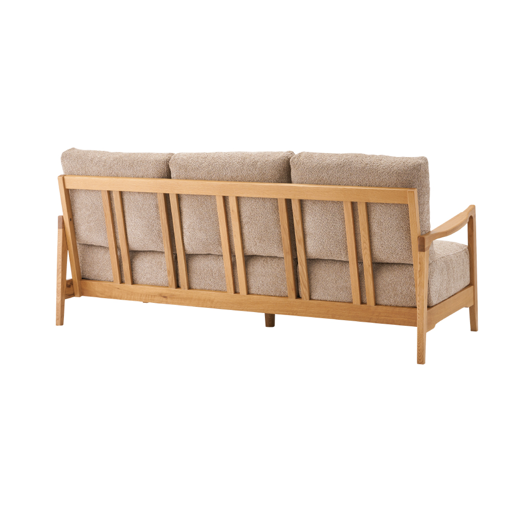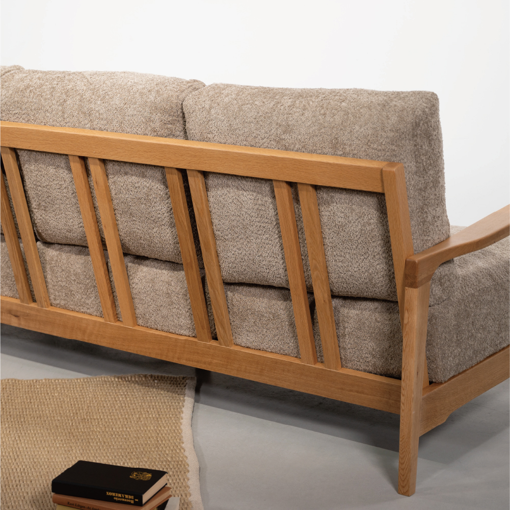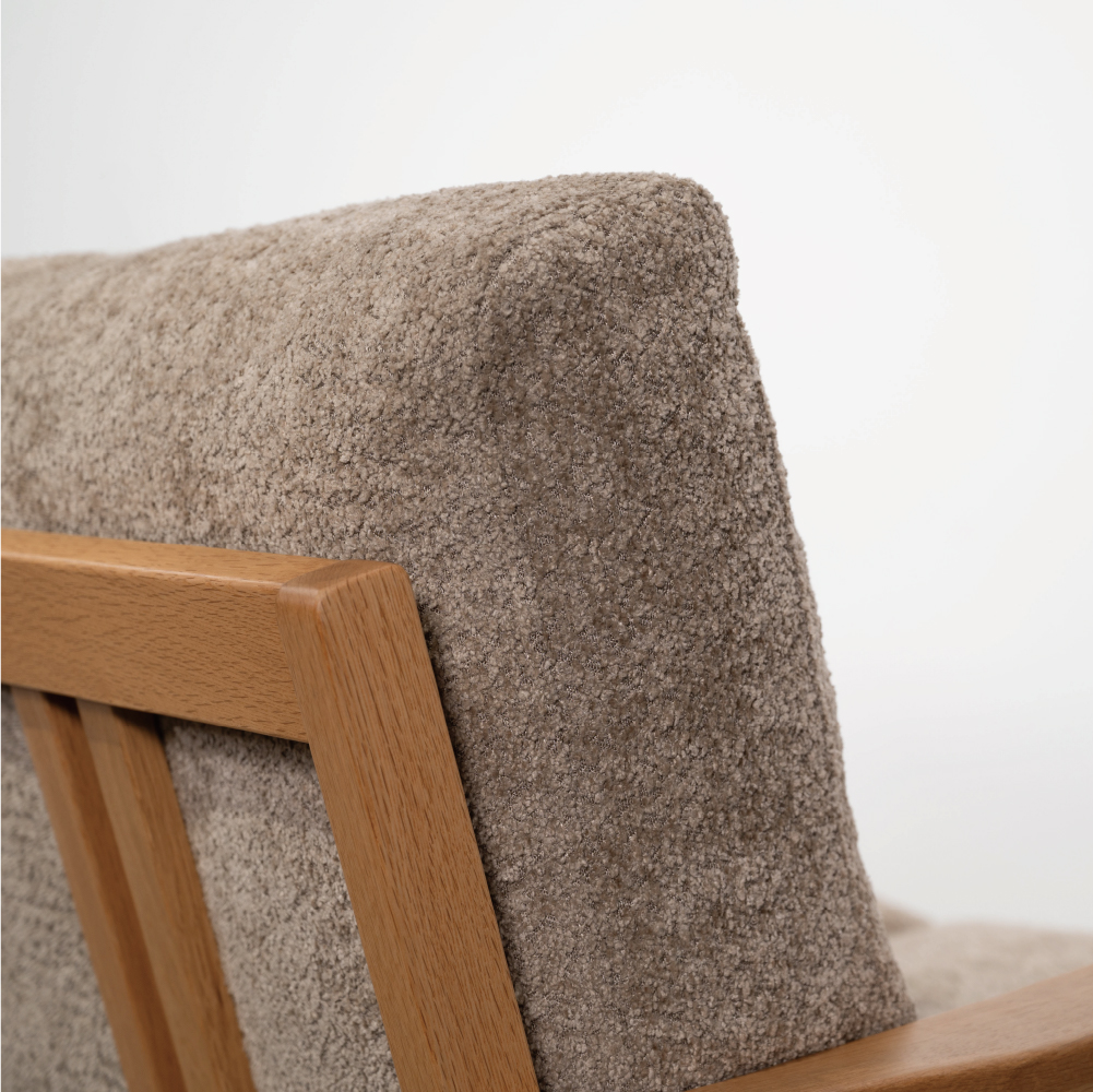 オーク材のフレームは穏やかな存在感を放ち、ブークレ生地の柔らかな質感が光を受けてほんのりと陰影を描いている。