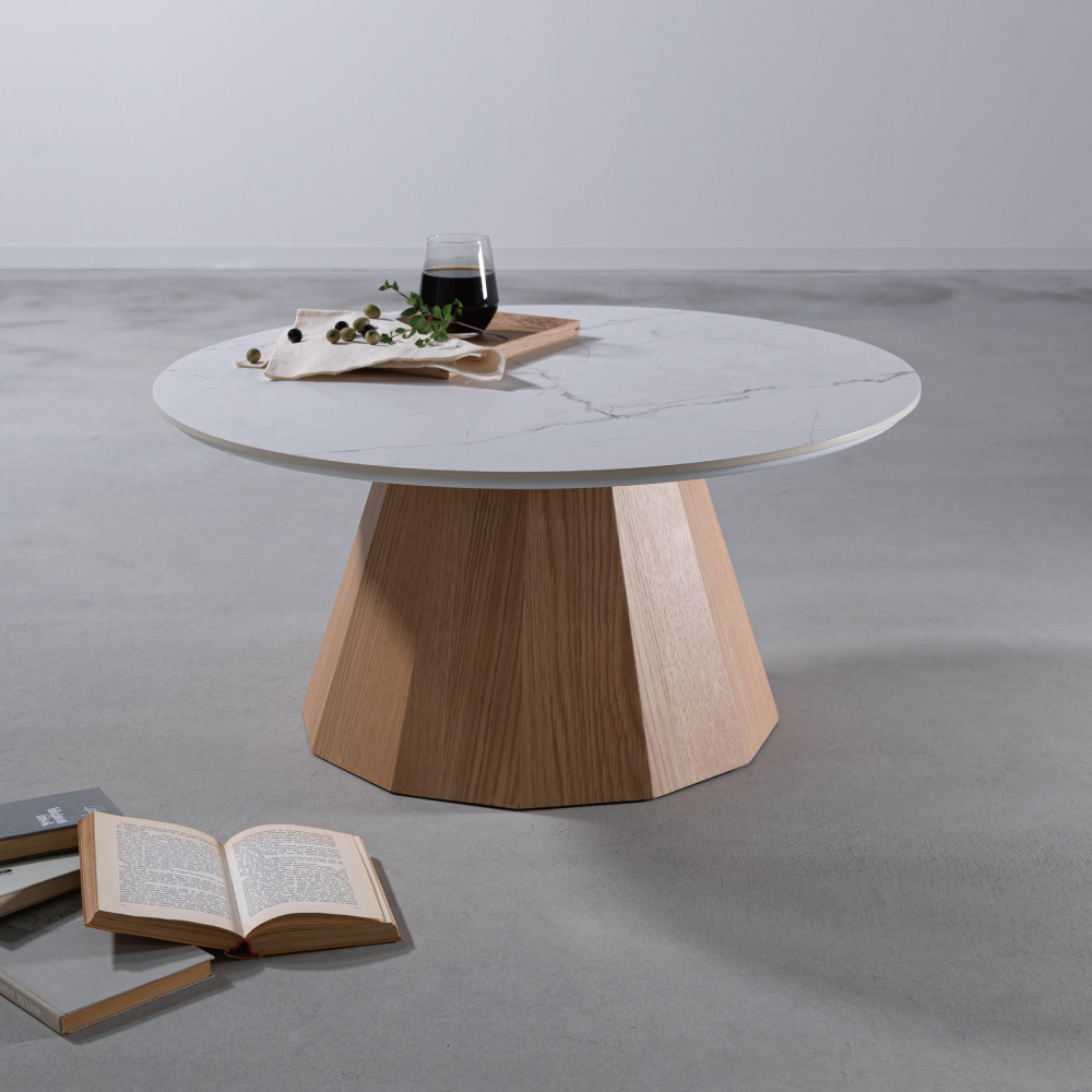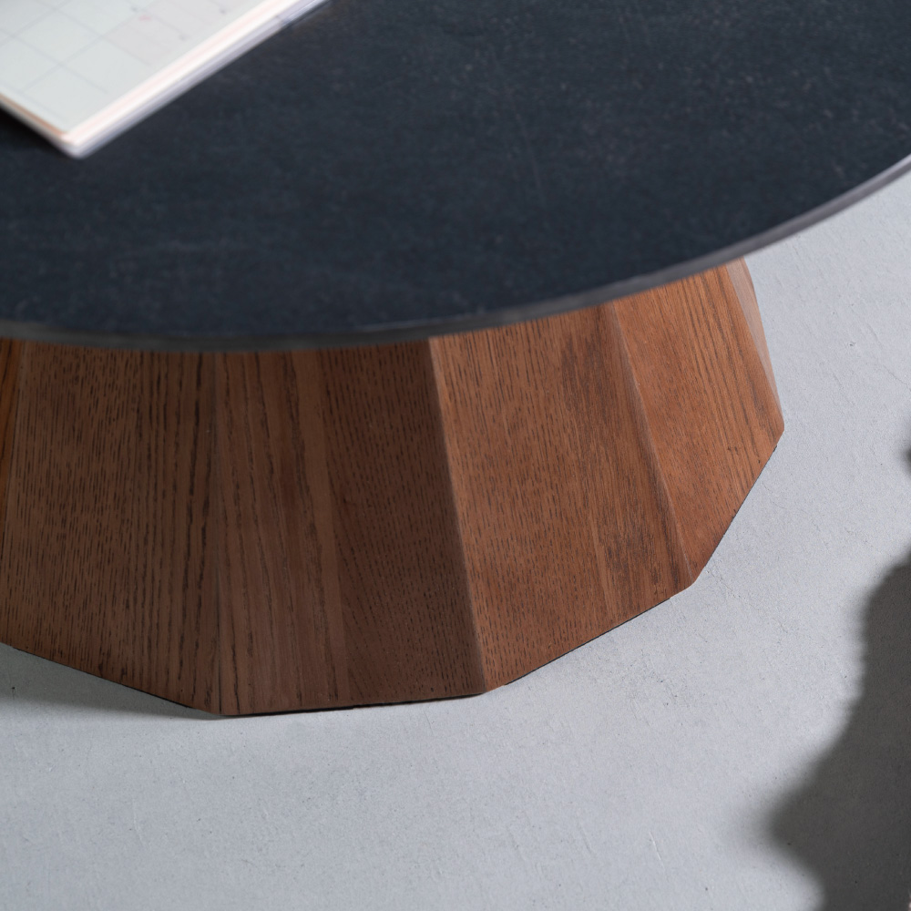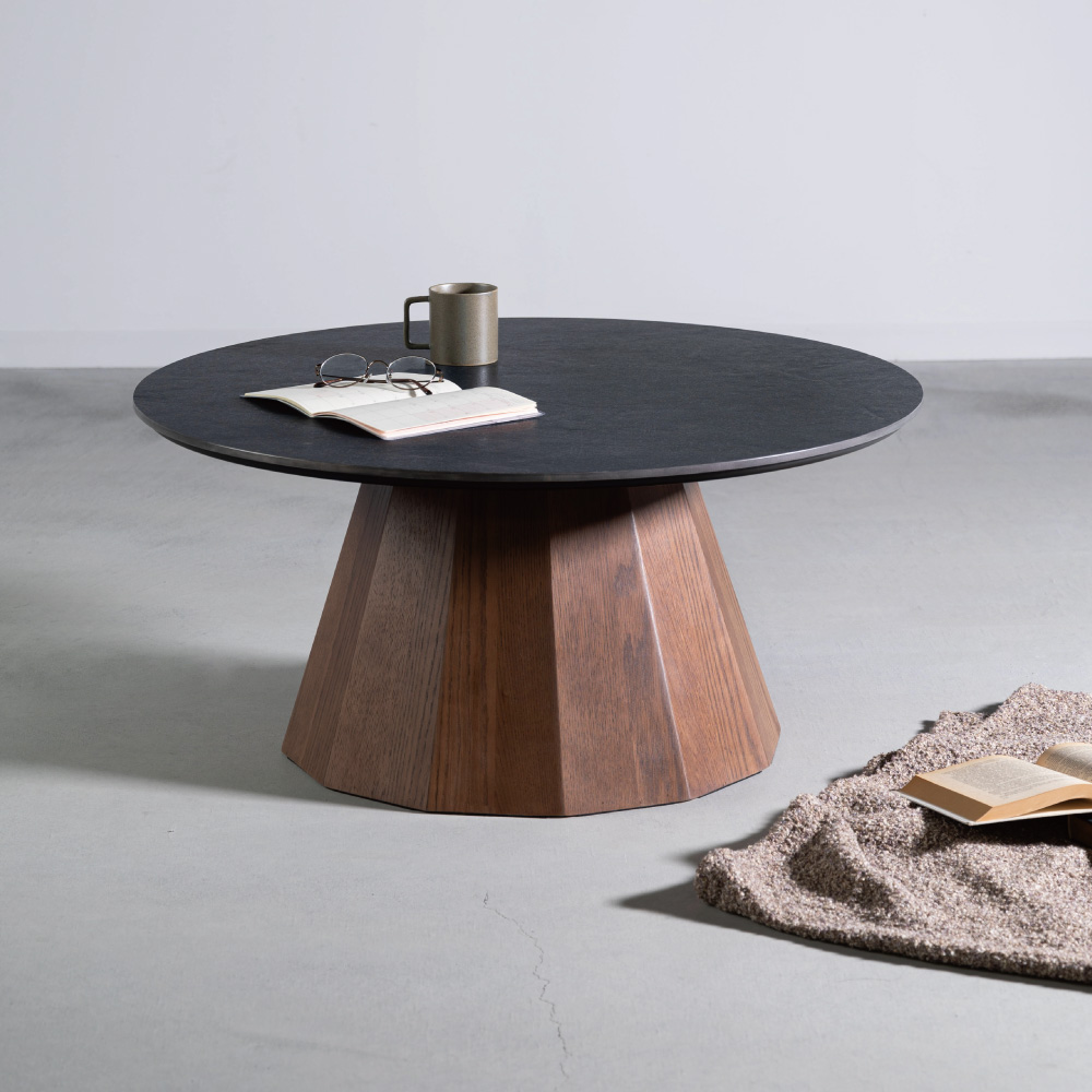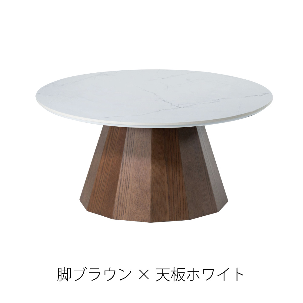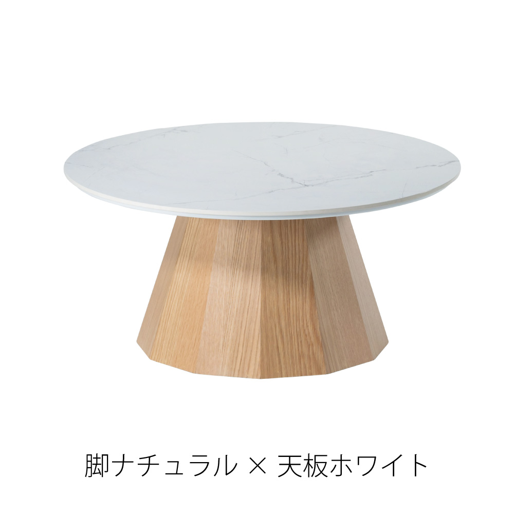 重厚感のあるブラックストーン調と、ホワイトの優雅な大理石調のセラミック天板を使用したリビングテーブル。 多角形の脚と組み合わせ、上質で存在感のあるデザインに仕上げています。 天板と脚部のカラーは、好みに合わせてお選びいただけます。