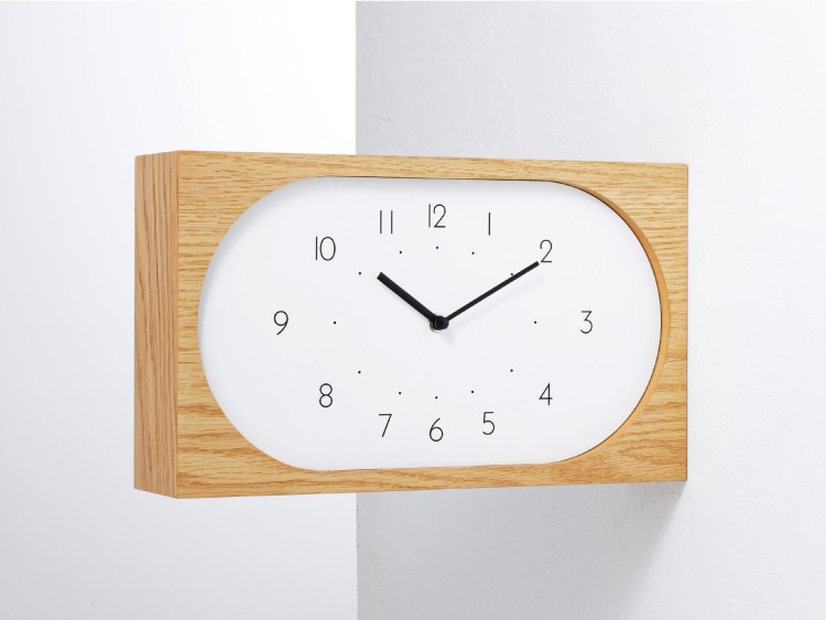 スクエアタイプのウッドフレームに、優しい楕円が重なる両面時計の新作。