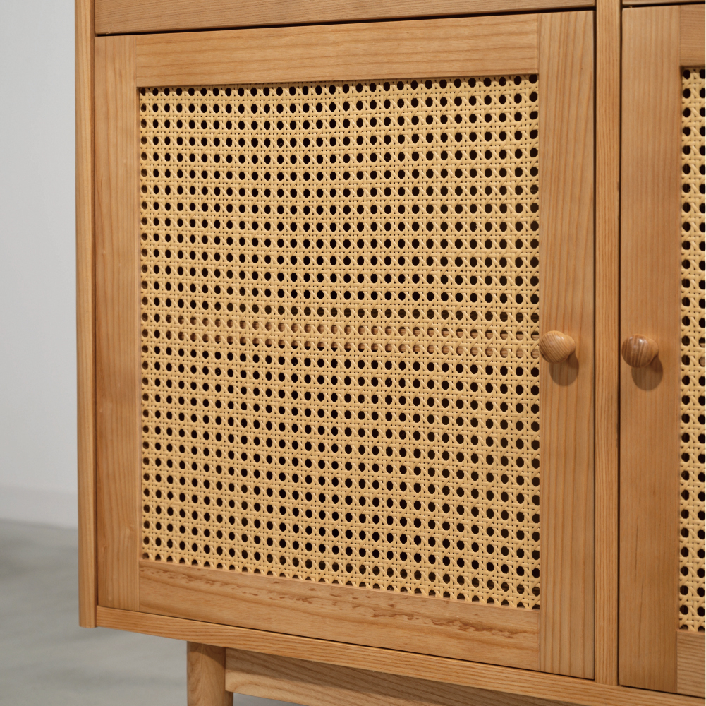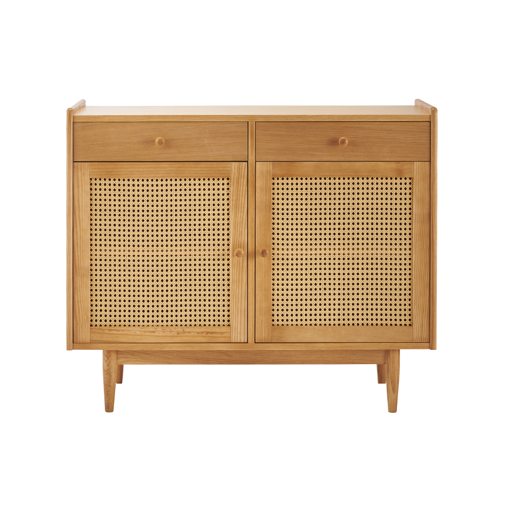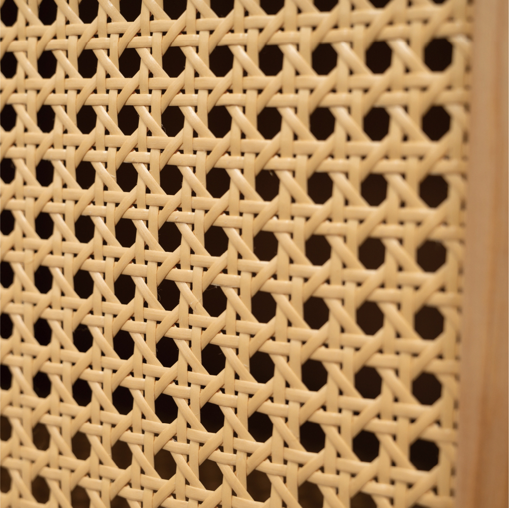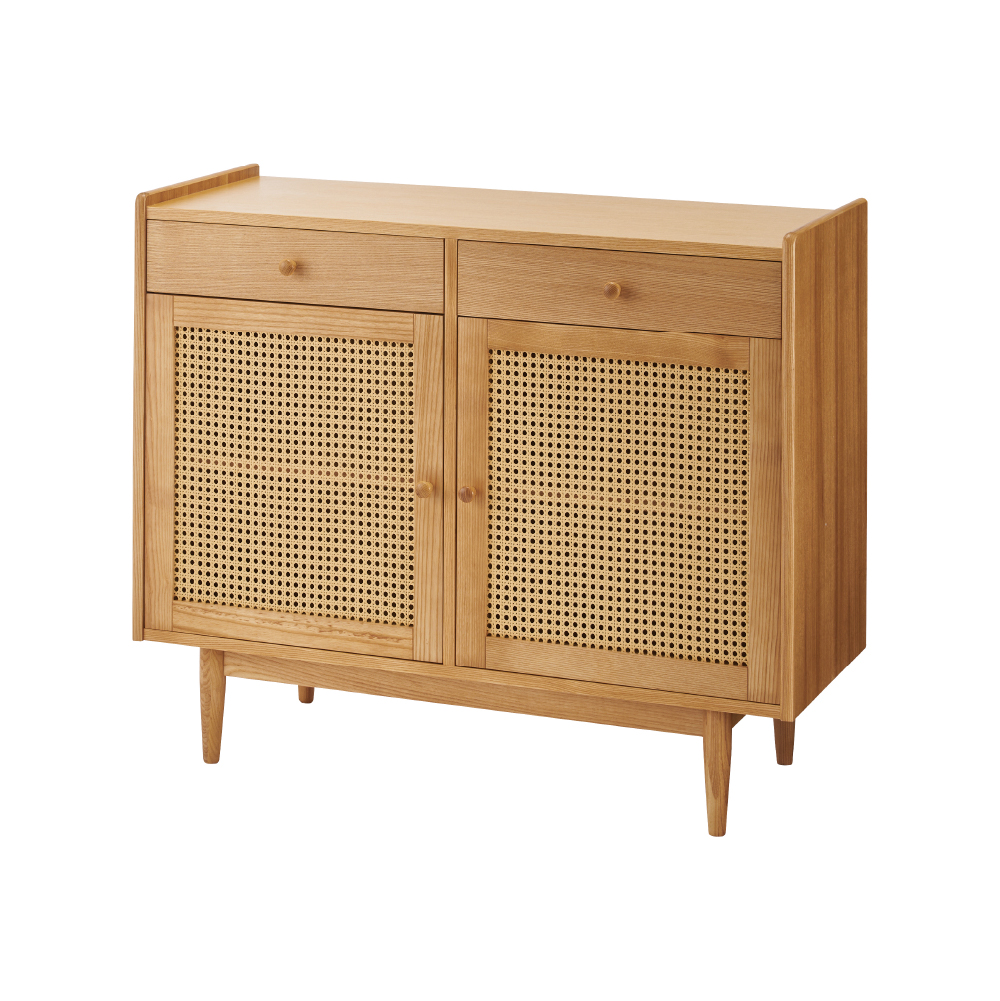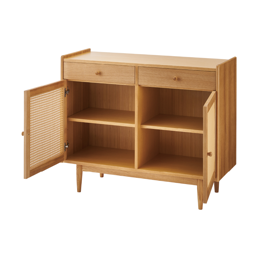 扉いっぱいに広がる編み目のデザインが軽やかさを与え、細身の脚が全体をすっと浮かせ、家具でありながら圧迫感を感じさせない。