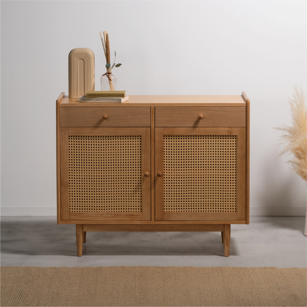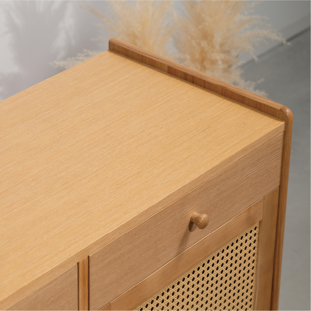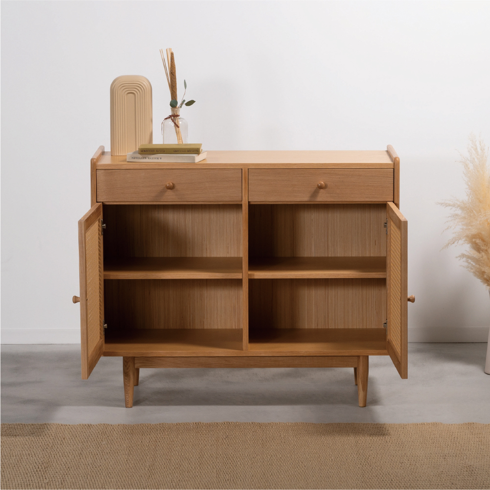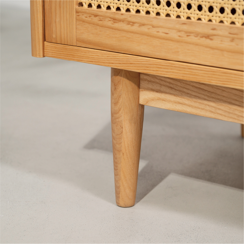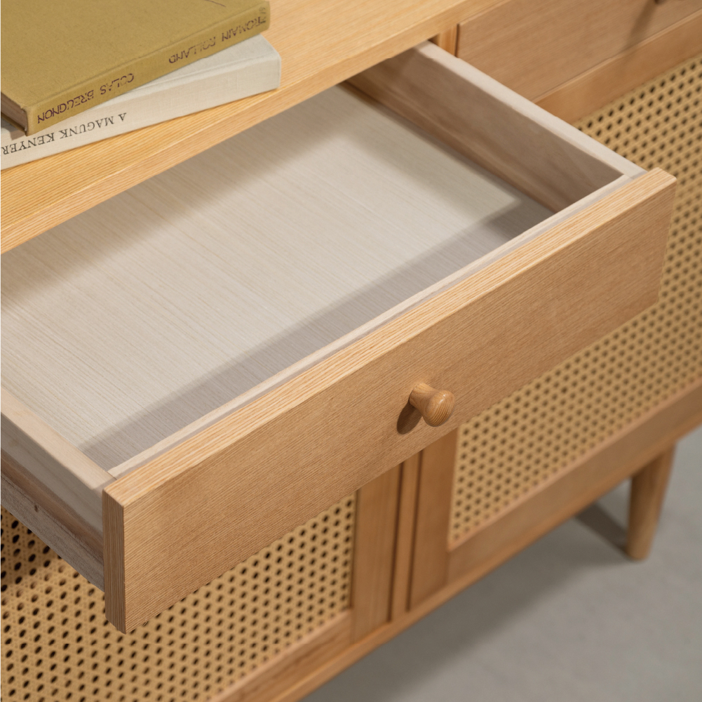 扉いっぱいに広がる編み目のデザインが軽やかさを与え、細身の脚が全体をすっと浮かせ、家具でありながら圧迫感を感じさせない。