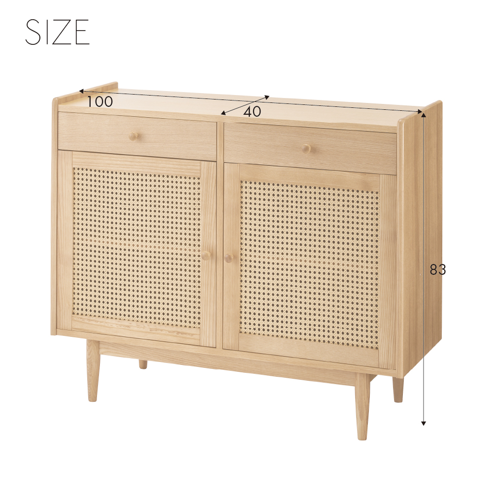 引き戸に大きくあしらったかごめ編みのデザインが際立ち、細身の脚で本体を